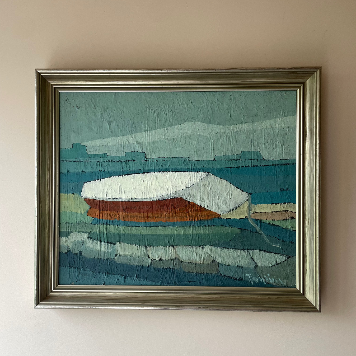 A quietly expressive coastal scene depicting a small boat resting on still water at low tide. Layered blocks of colour in soft blues, greens, and warm earth tones create a sense of balance and calm, while the textured surface gives the work depth and character.