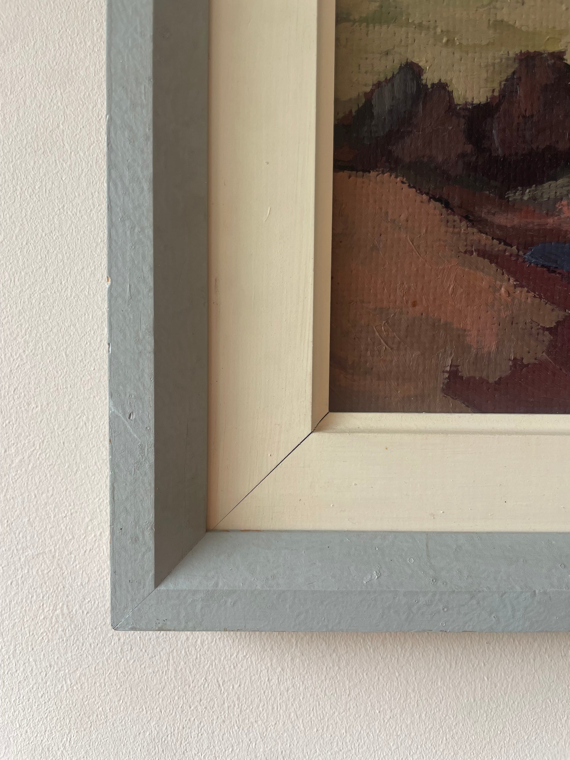 Framed in a muted two-tone wood frame that complements its tones beautifully.
