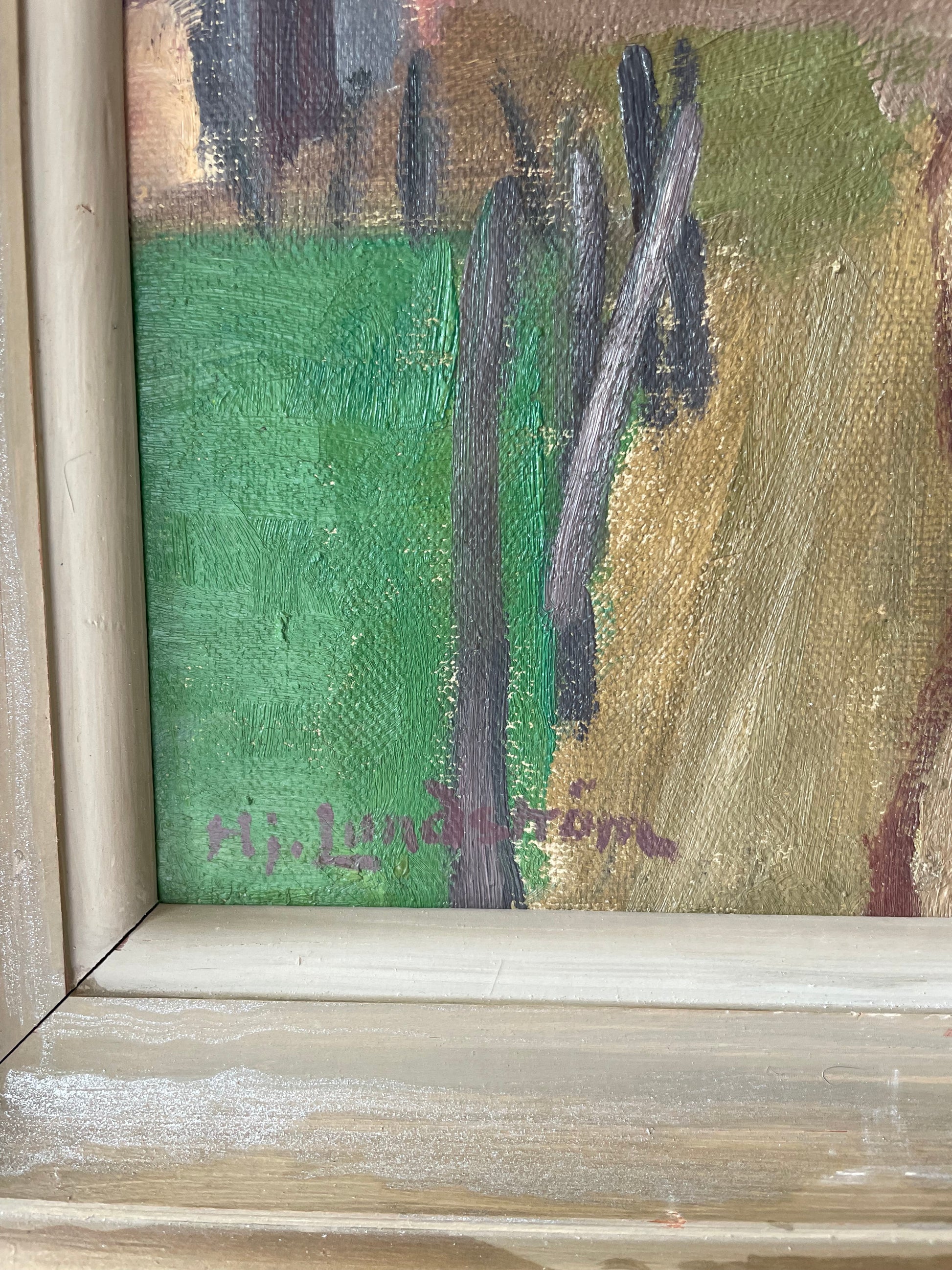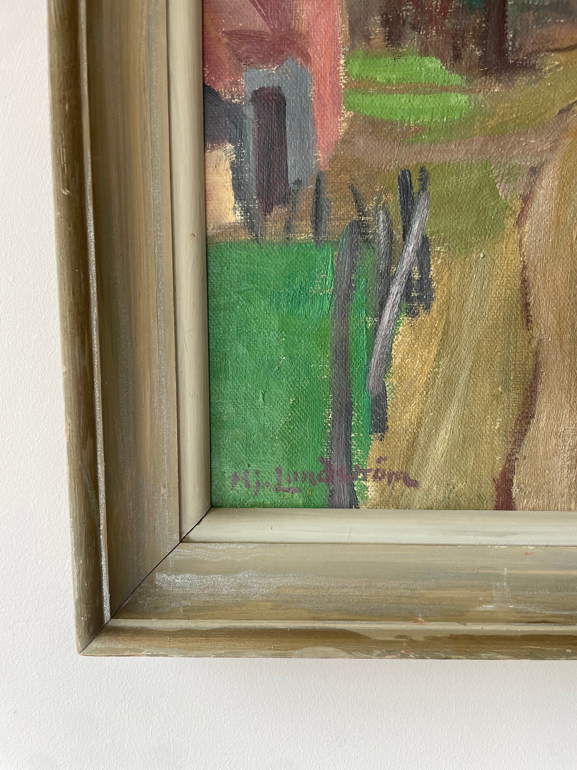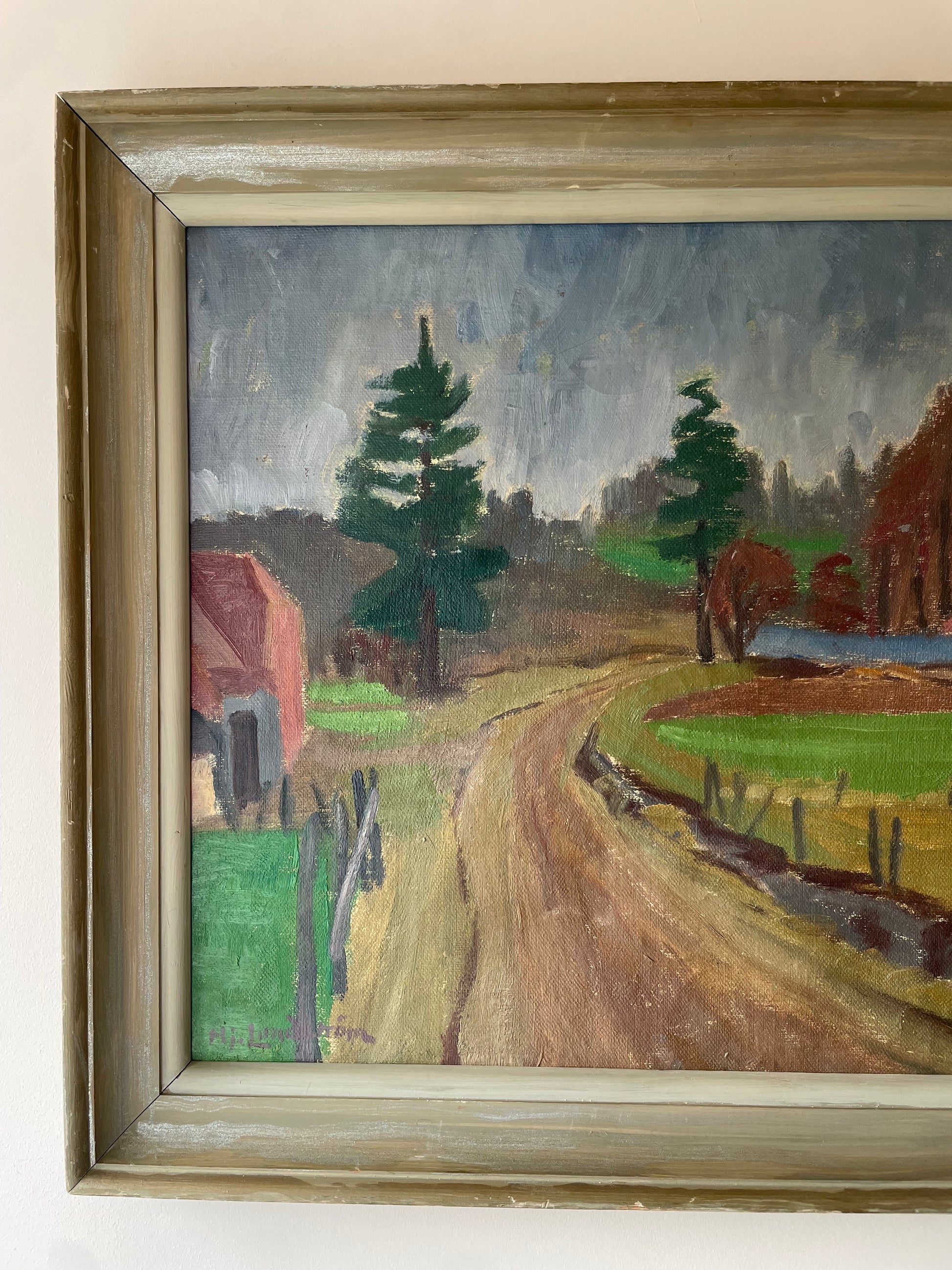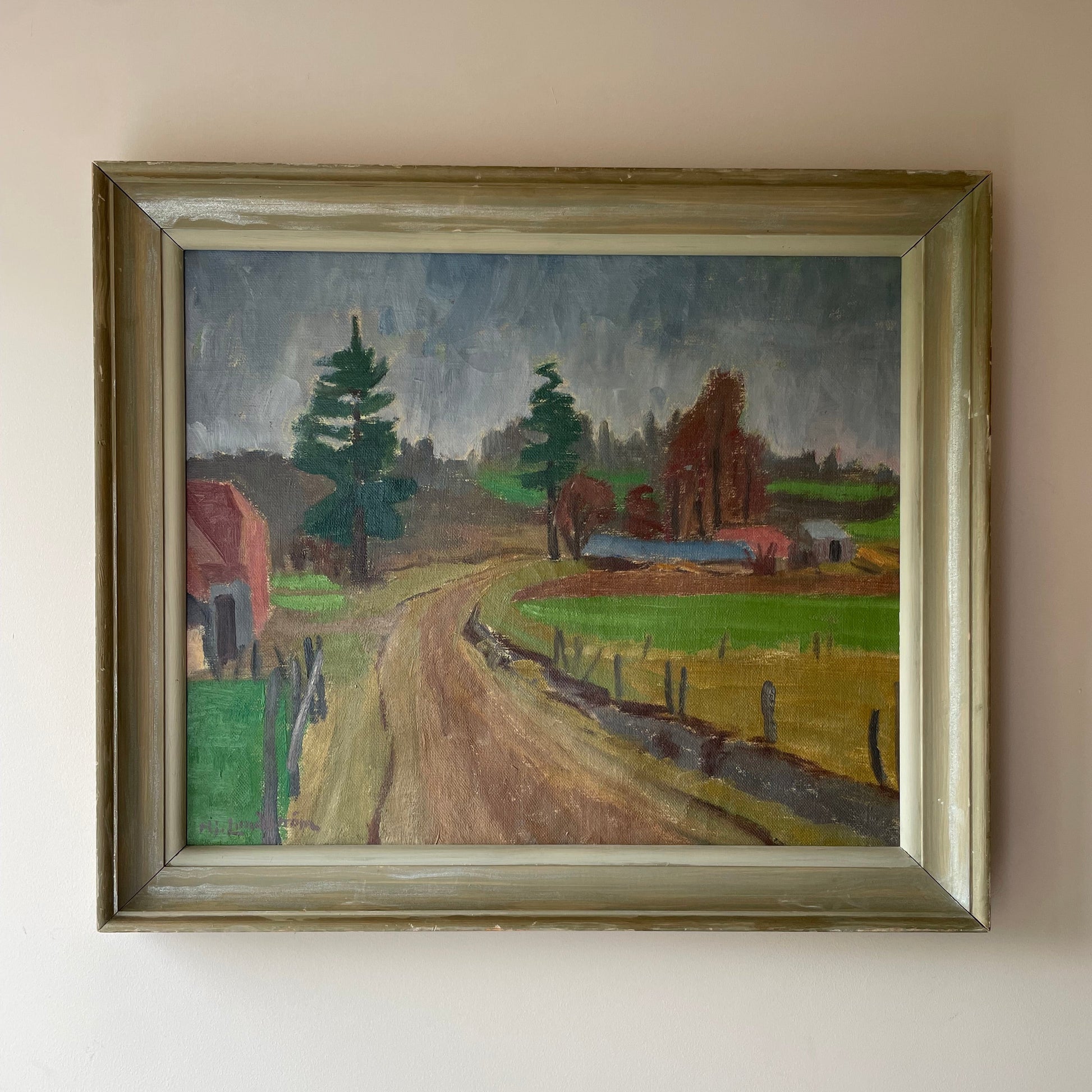 A charming mid-century landscape capturing a quiet rural scene with winding roads, red-roofed barns, and trees touched by autumn colour. The artist’s expressive brushwork and earthy palette evoke a sense of calm, reflecting the beauty of countryside life.