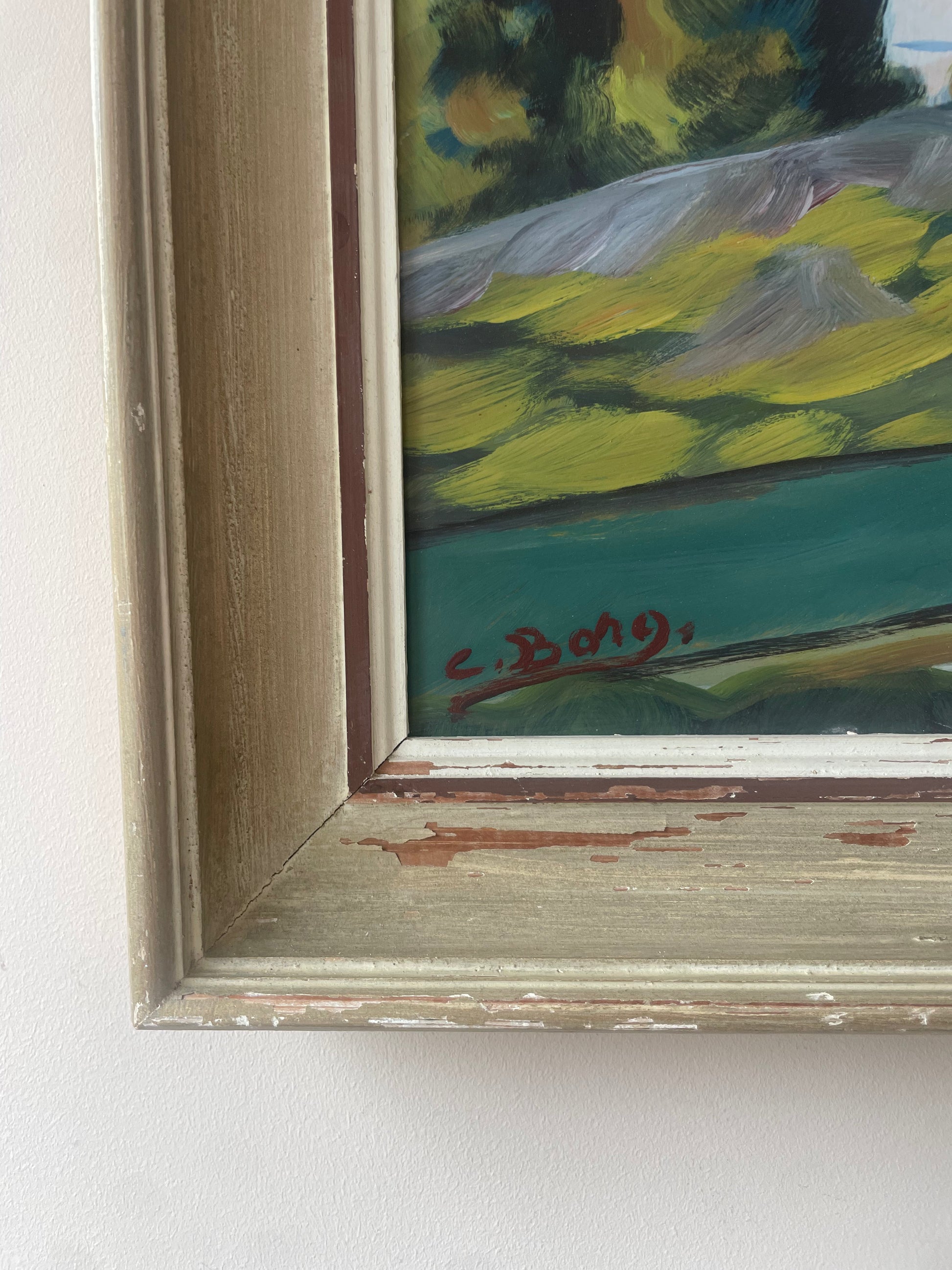 A large calm vintage coastal scene looking out across a pale blue bay towards warm, rocky headlands. Layered greens in the foreground and sculptural pine trees frame the view, giving the piece a distinctive mid-century feel with clean shapes and confident brushwork.