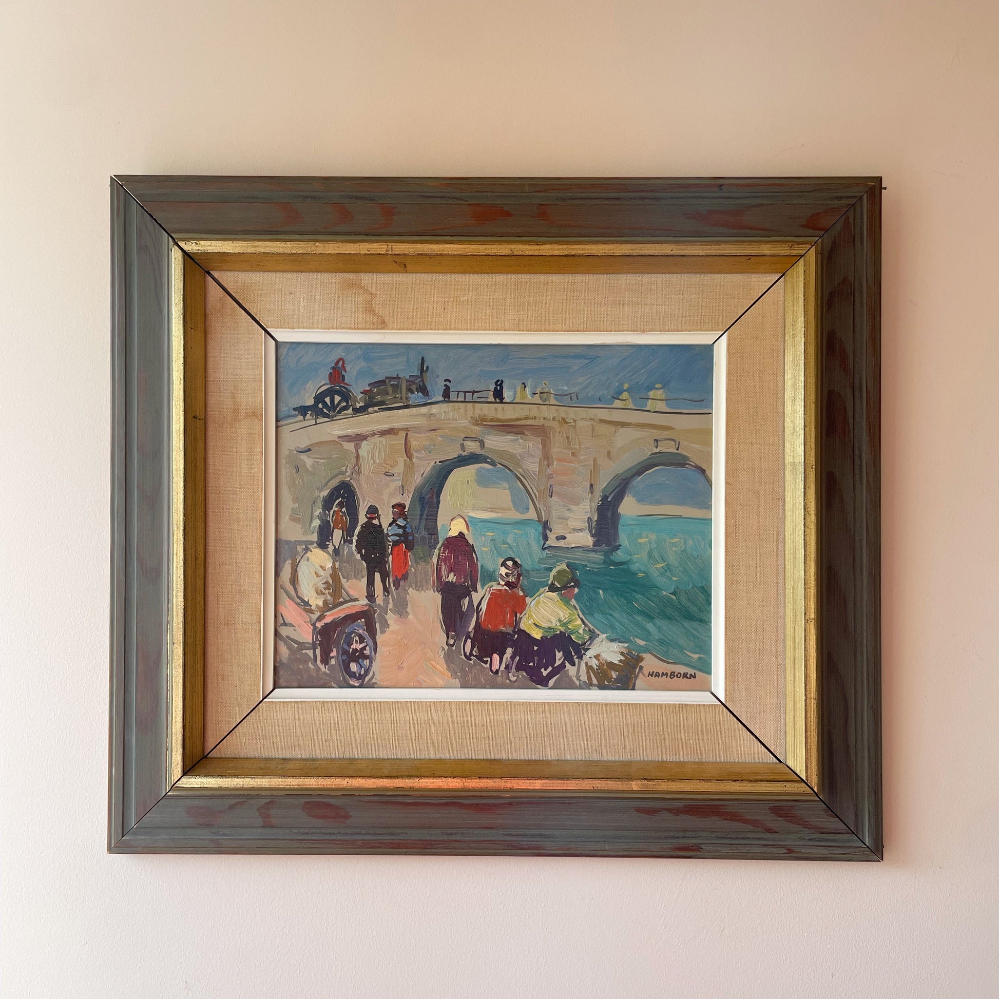 A vibrant mid-century scene of people gathered by a stone bridge, painted with loose, expressive strokes. The colours and movement give the piece a lively, atmospheric feel.