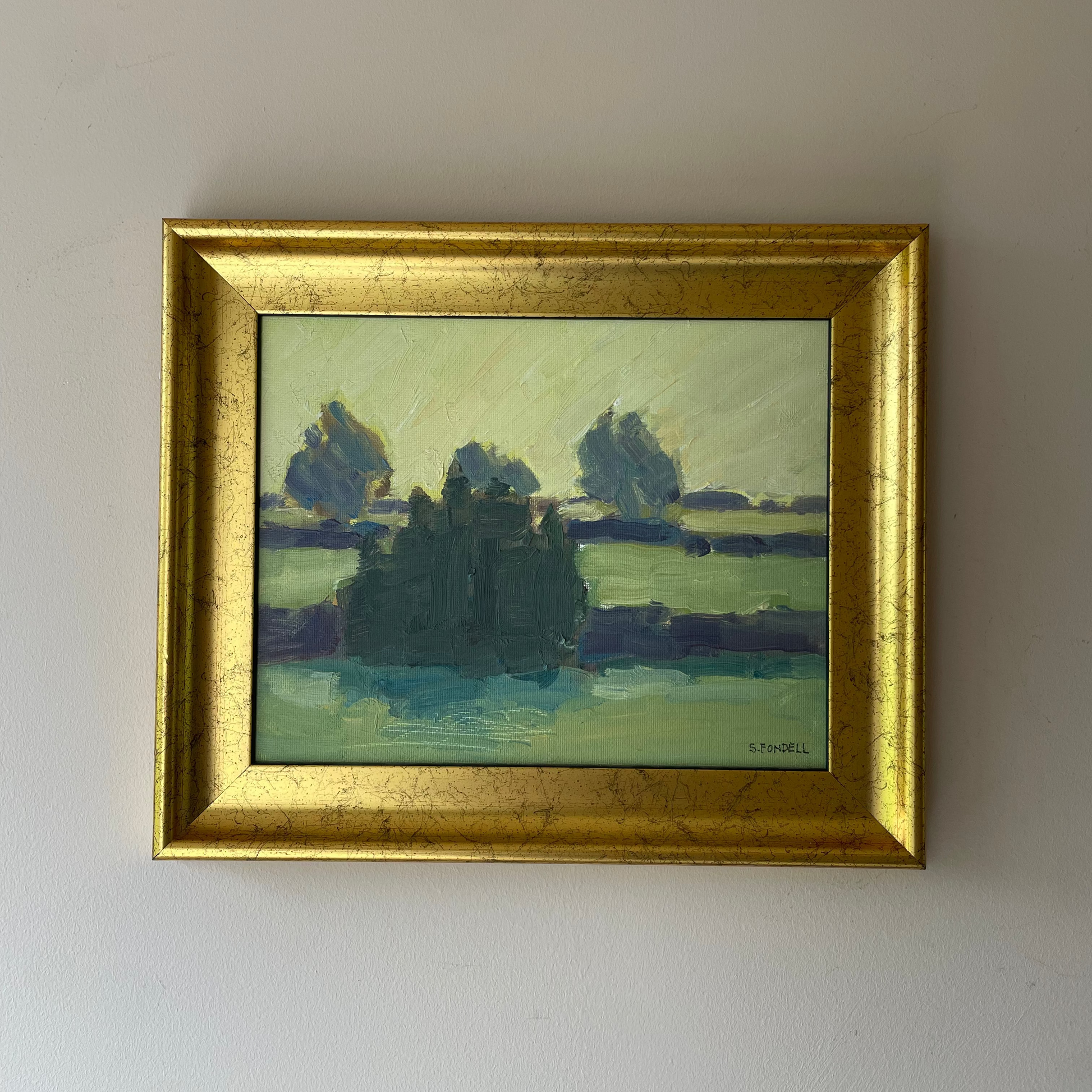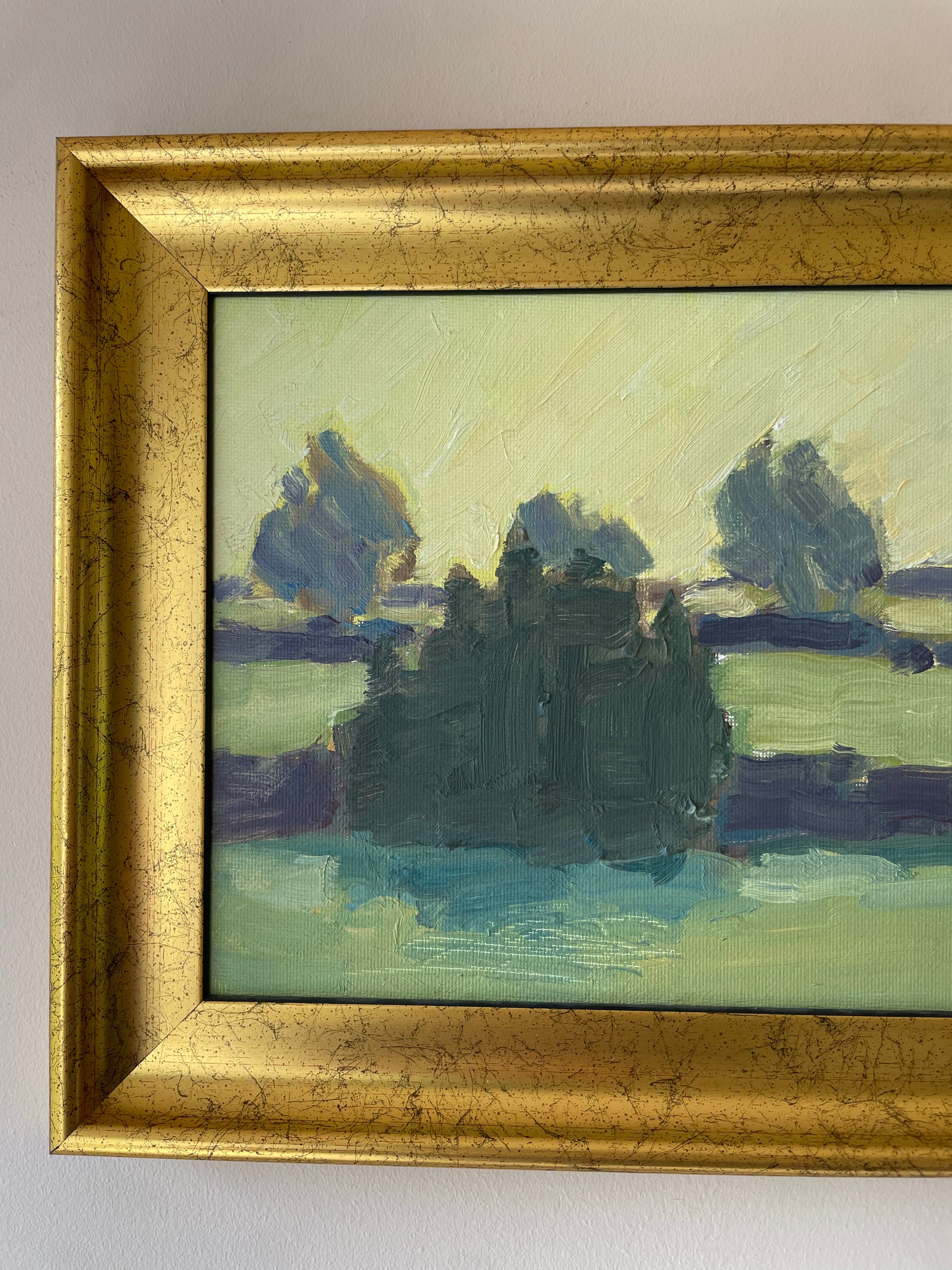 A softly painted landscape depicting open fields and distant trees under a pale sky. Muted greens and blues are layered with loose, expressive brushstrokes, creating a sense of depth and quiet atmosphere.