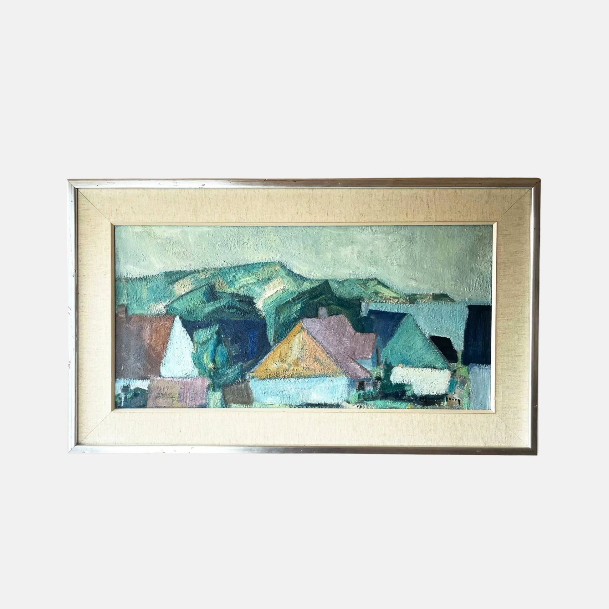 A soft, atmospheric village scene rendered in textured oils, this vintage painting layers muted greens, blues, and lilac tones over a cluster of rooftops and rolling hills. The abstracted shapes and calm palette give it a quiet mid century feel.