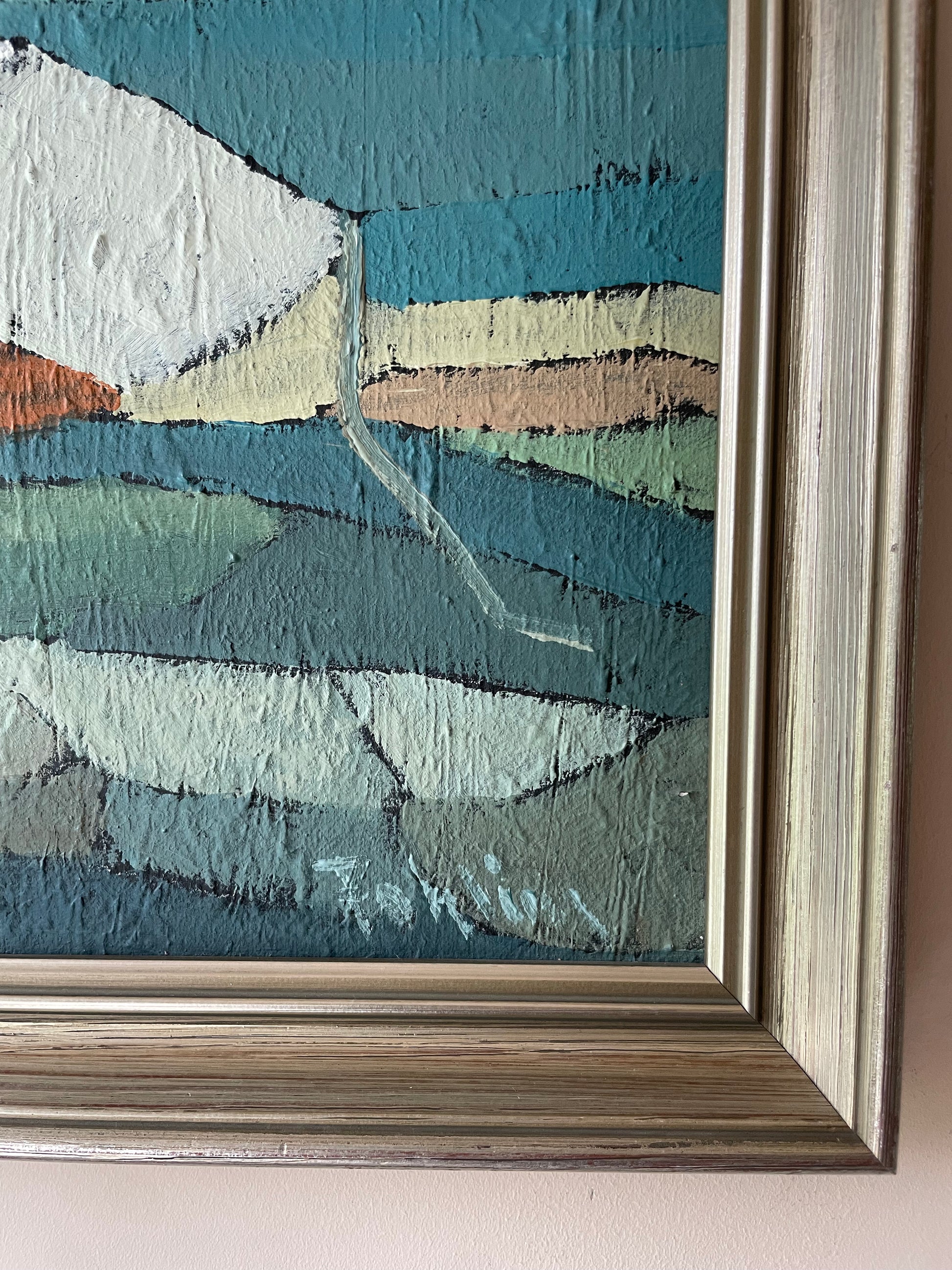 A quietly expressive coastal scene depicting a small boat resting on still water at low tide. Layered blocks of colour in soft blues, greens, and warm earth tones create a sense of balance and calm, while the textured surface gives the work depth and character.