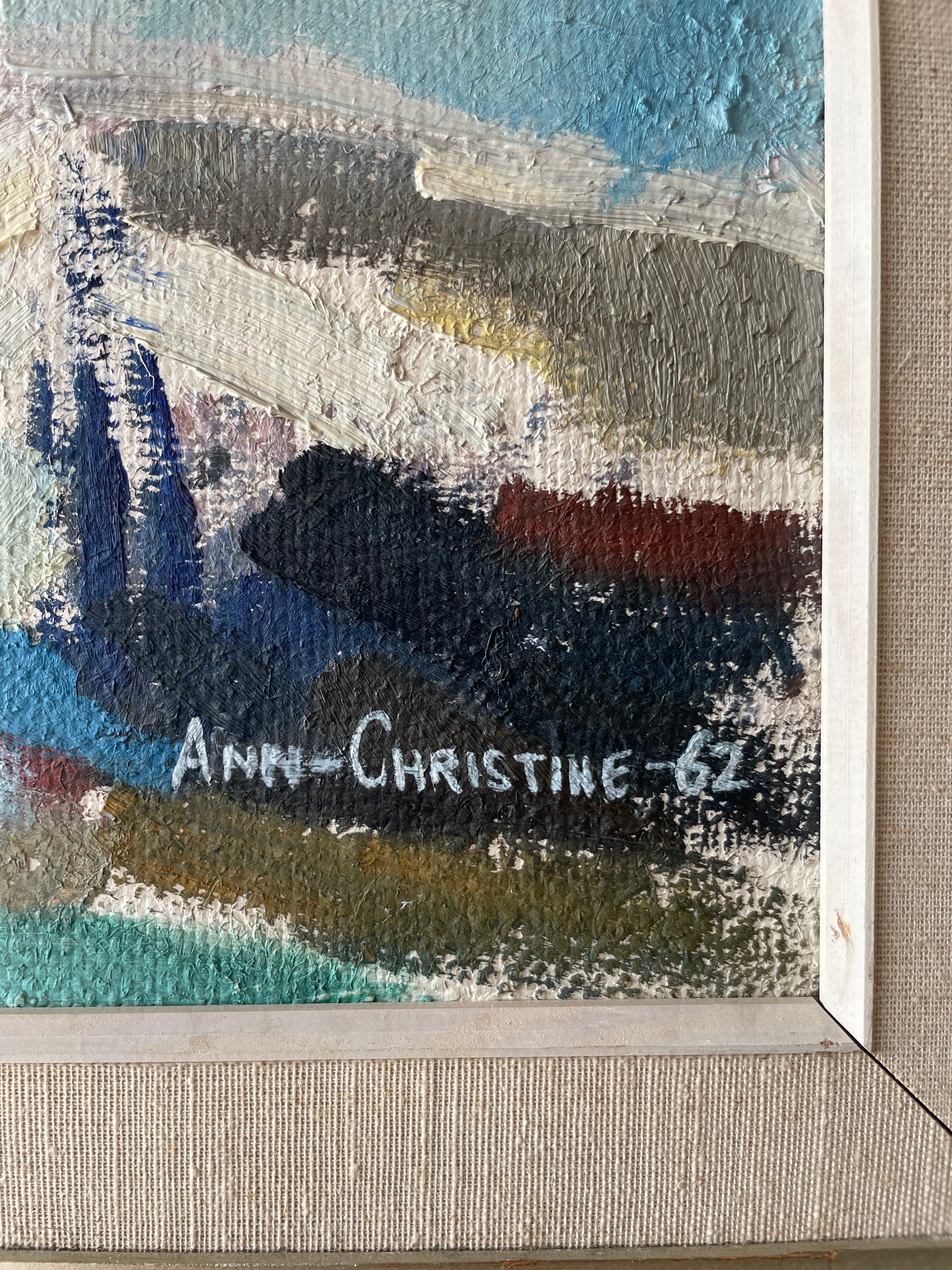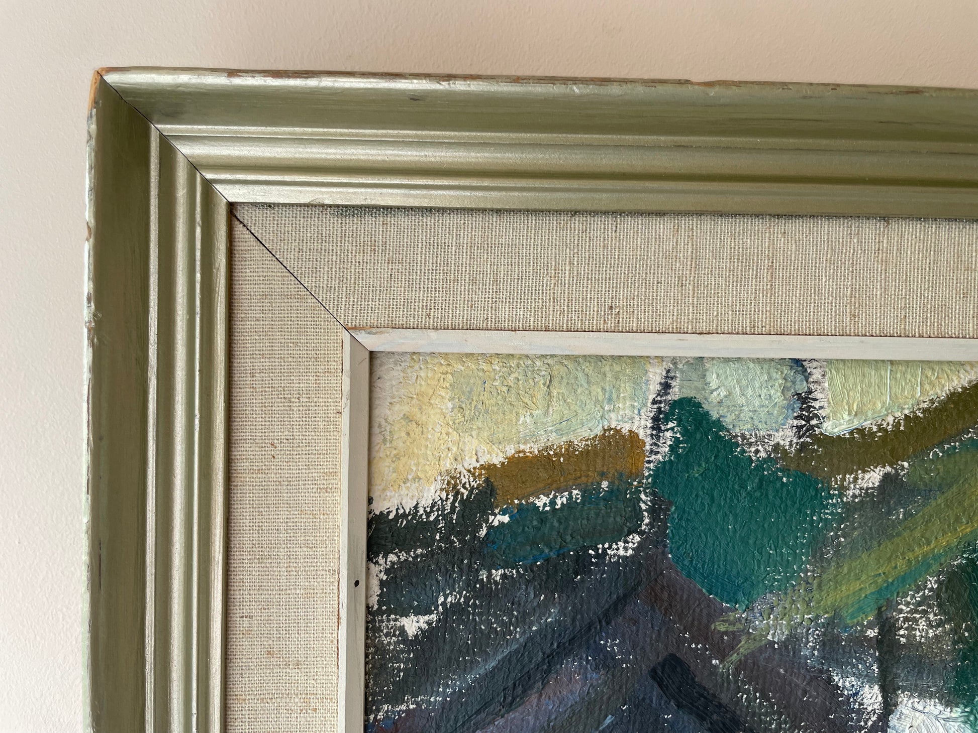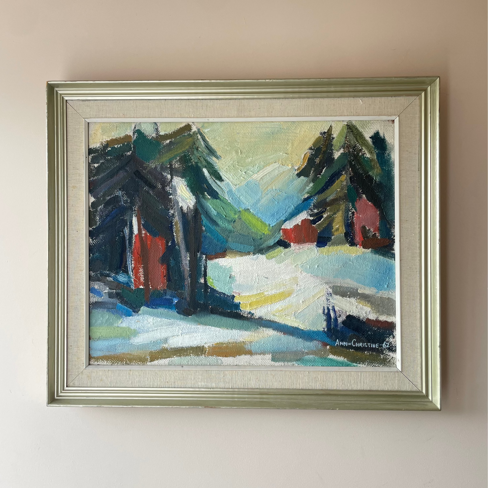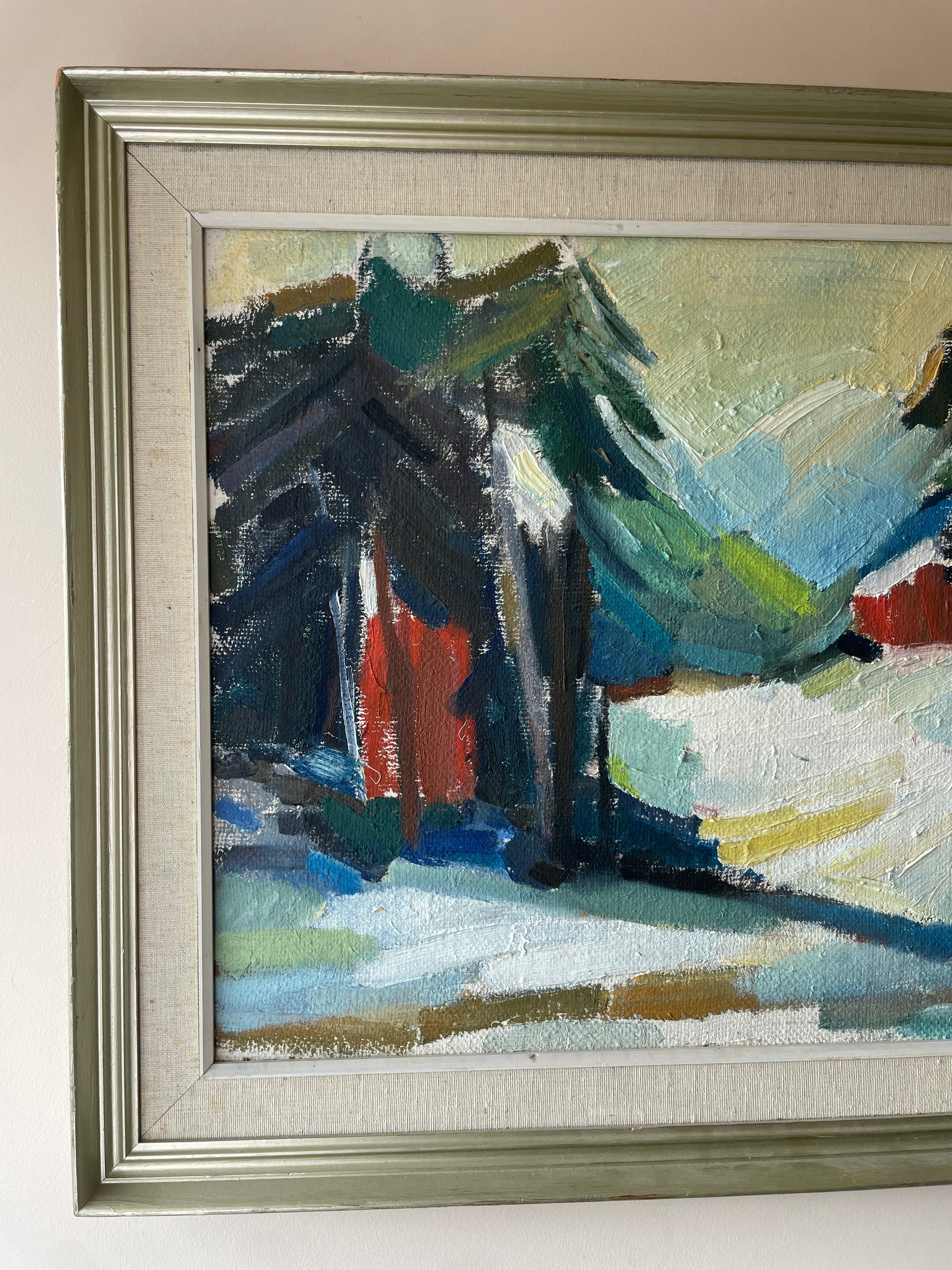 A vibrant Scandinavian winter scene painted in bold, expressive strokes. Deep greens, icy blues, and touches of red create a lively contrast that captures the crisp atmosphere of a snowy mountain valley. Its textured finish and modernist style make it a striking statement piece.