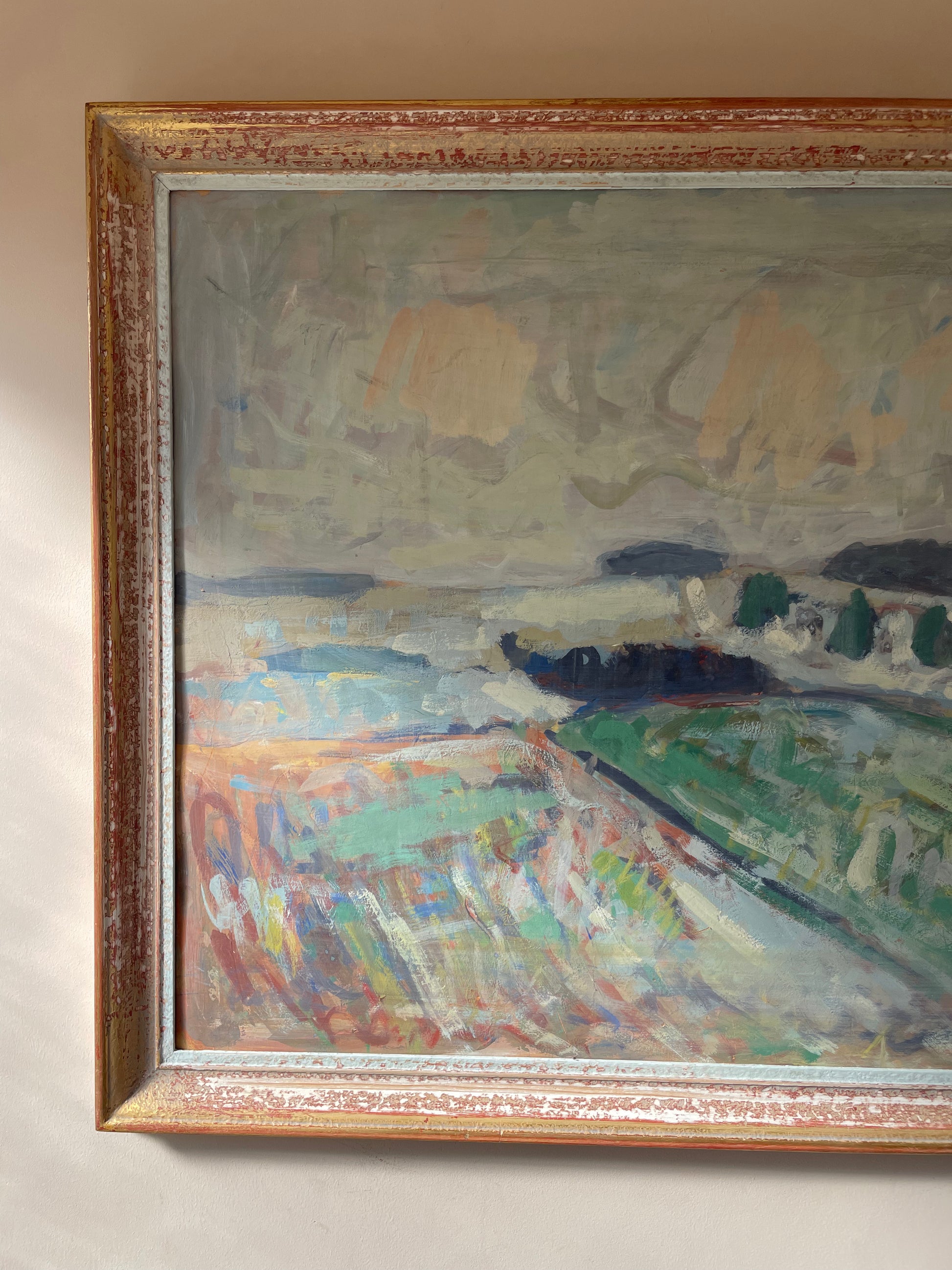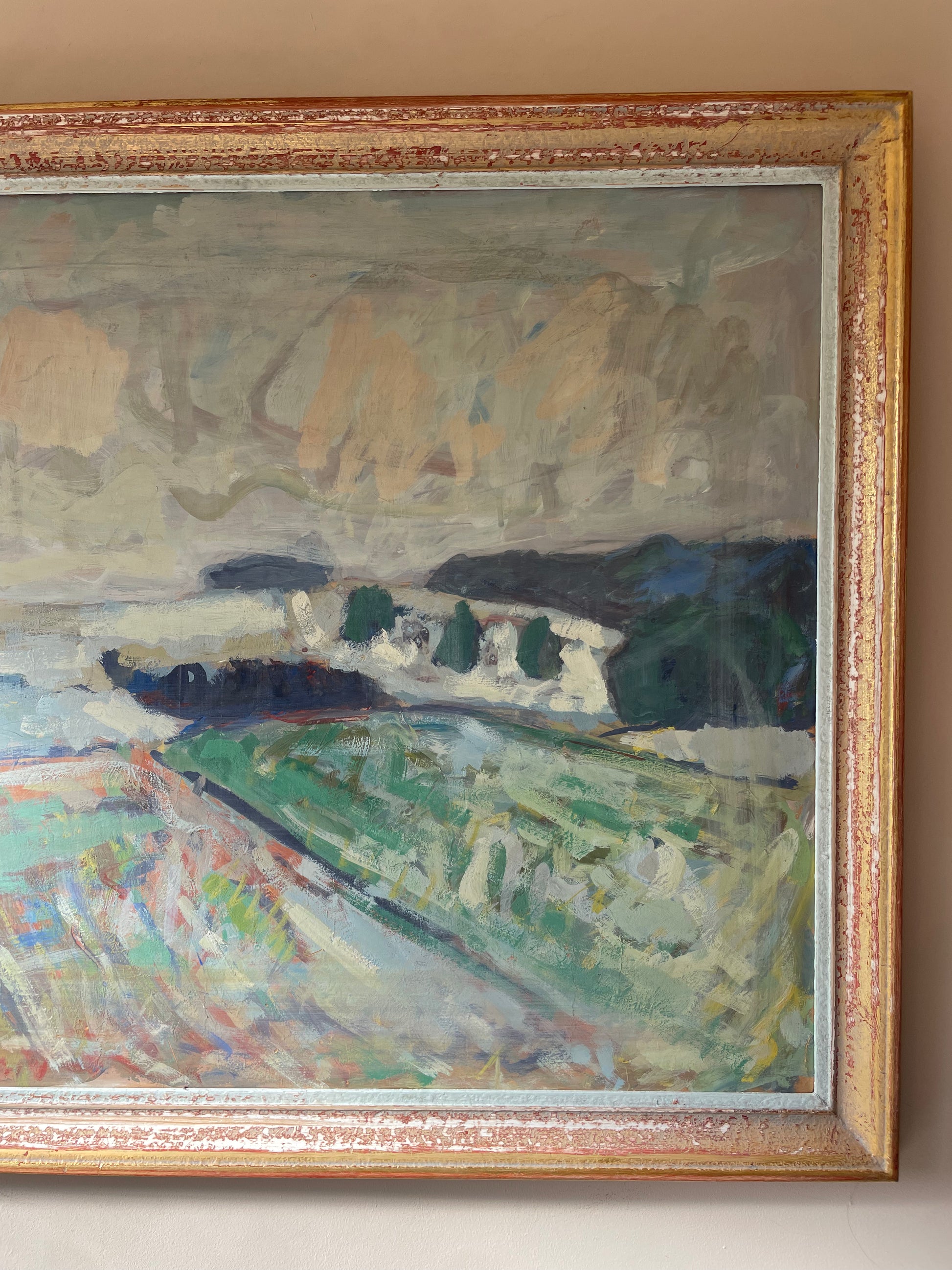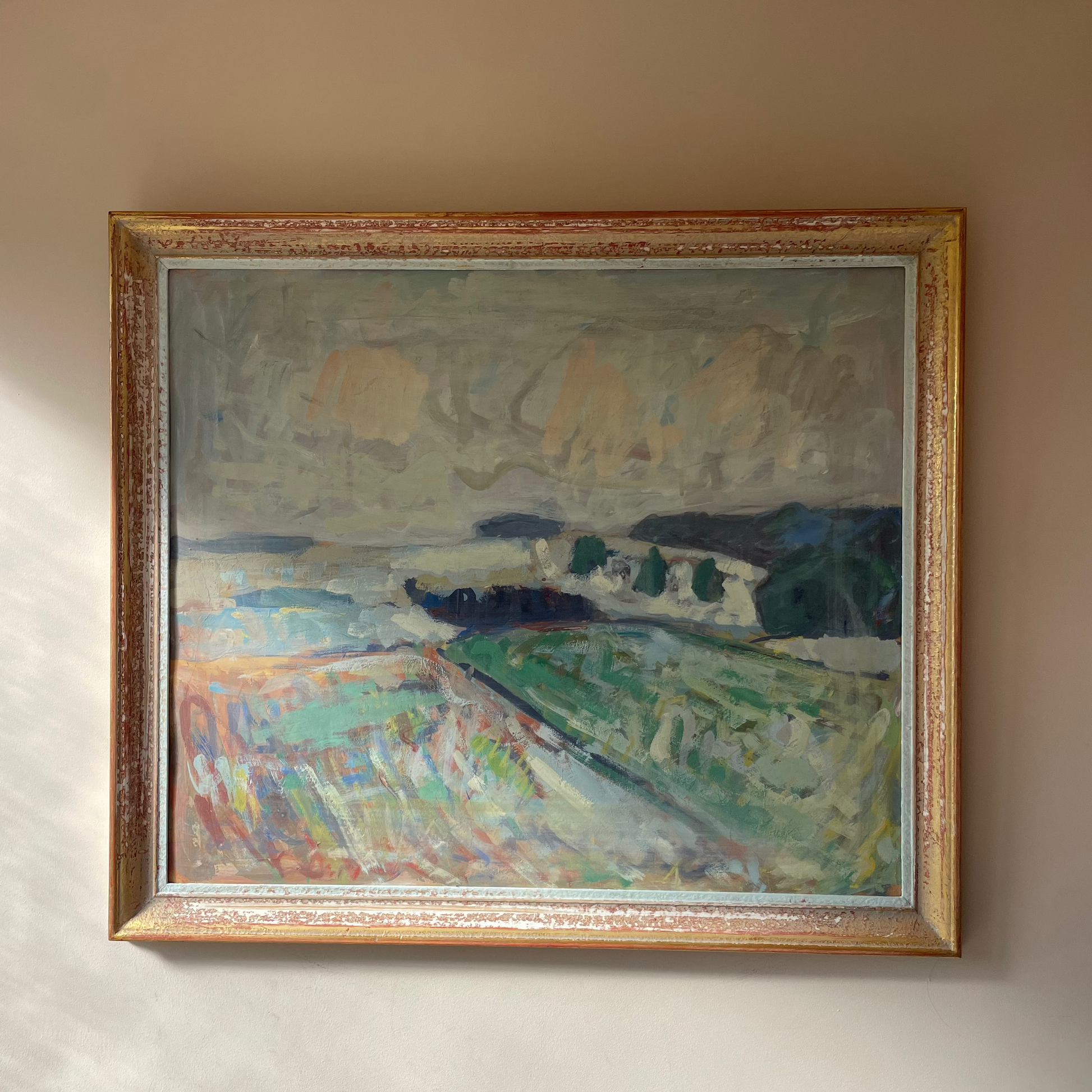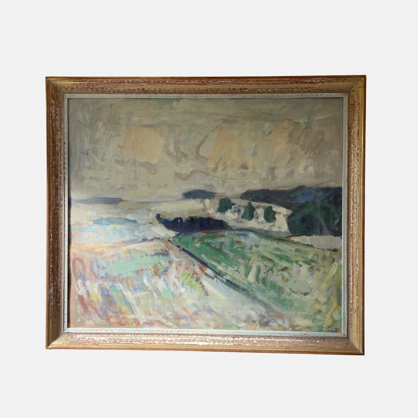 A large, soft and atmospheric vintage landscape with sweeping brushwork, muted coastal tones, and a calm, open horizon. The combination of pale sky, sea blues, and gentle greens gives it a quiet, painterly feel.