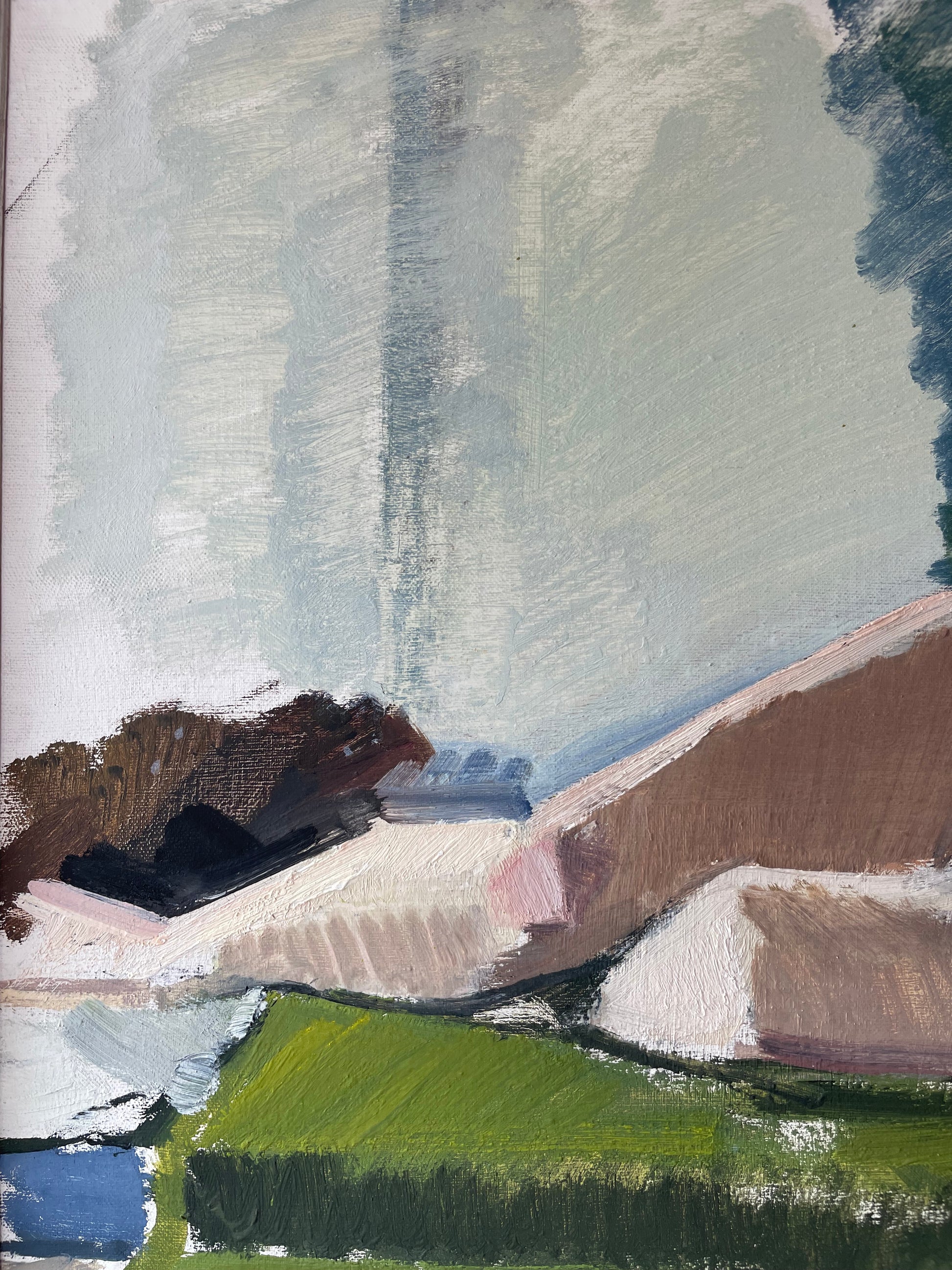 An expressive modernist oil painting depicting a reclining female figure resting against soft, abstracted tones of grey, blue, and olive green. The artist’s bold brushwork and geometric forms create a sense of calm strength and quiet intimacy.