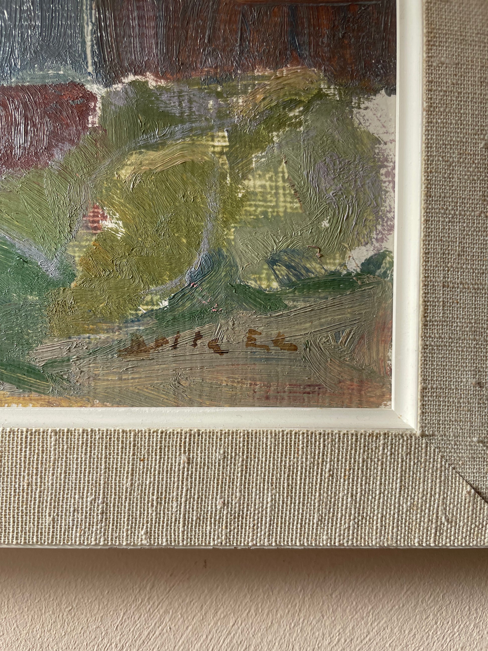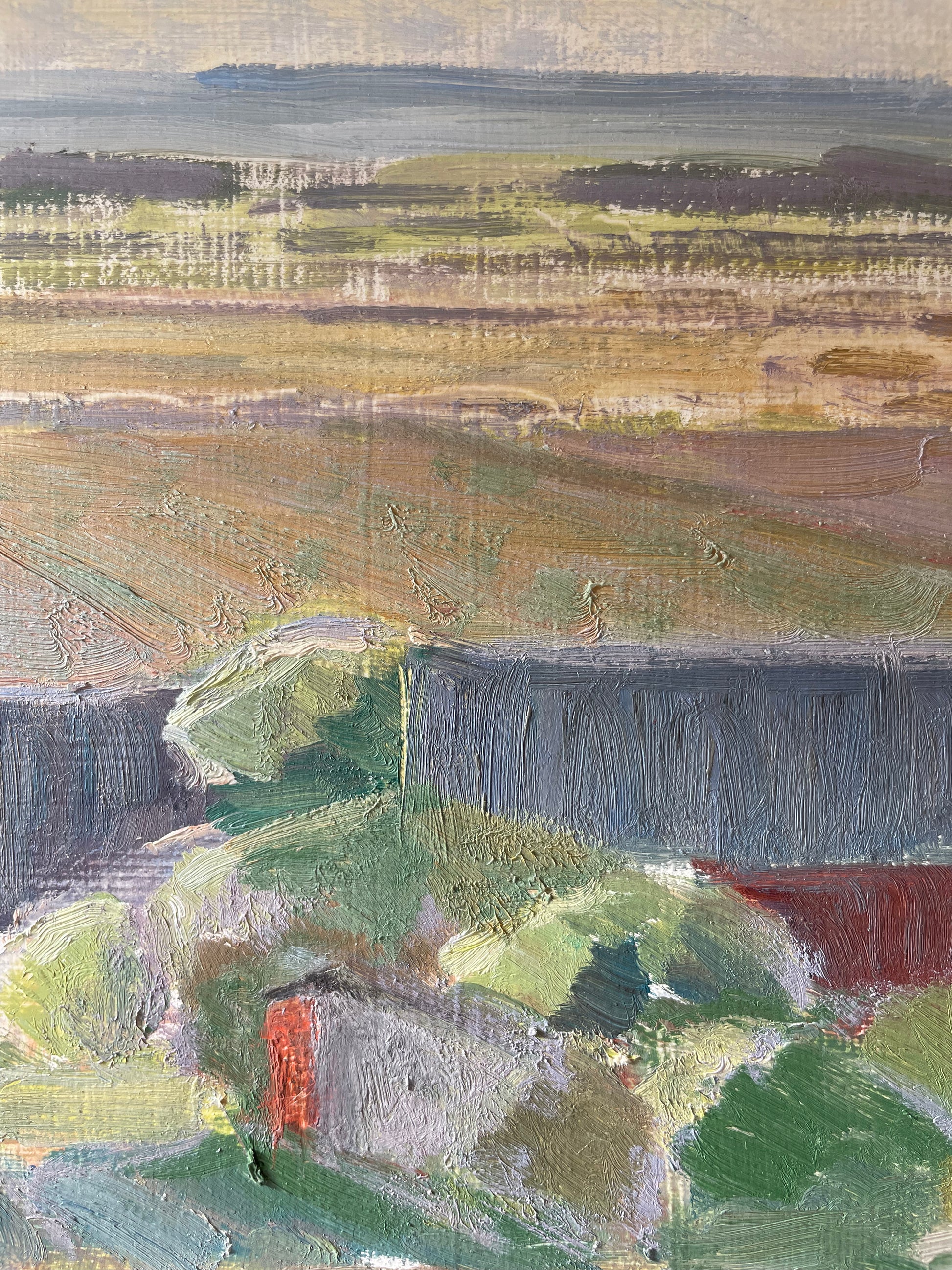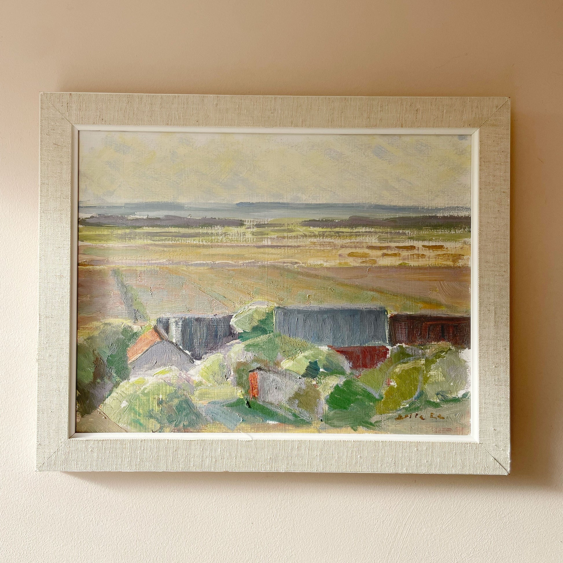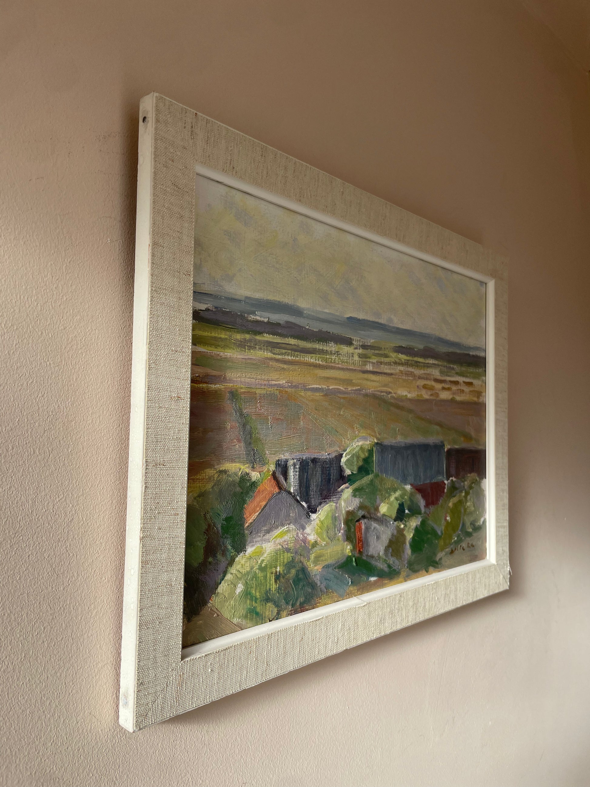 An atmospheric vintage landscape of low fields and scattered farm buildings, painted in gentle layers of sage, straw and soft grey. Loose, textured brushwork gives a hazy, light-filled quality, while the pale linen-effect frame adds a calm, rustic elegance.
