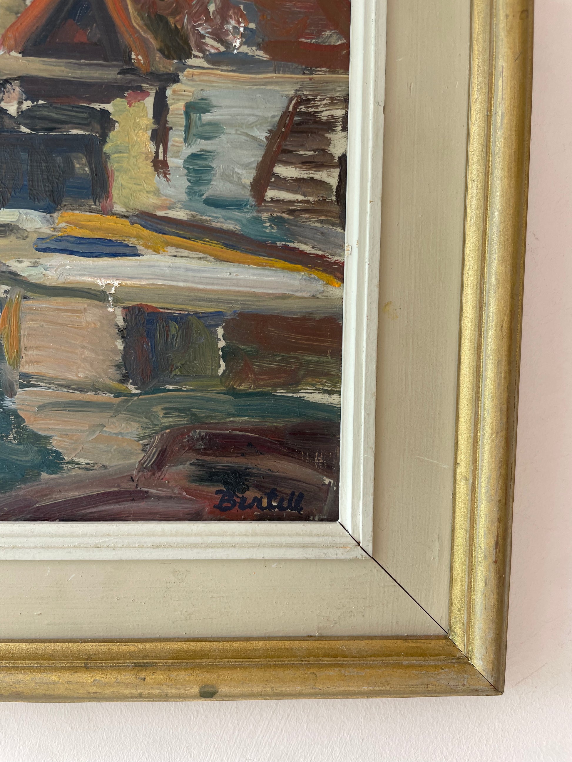 An original vintage Swedish painting featuring sea huts from Sjöbodar, Sweden, most likely painted in the 1950s. This charming harbour scene captures the quiet character of the waterfront with moored boats, still water, and sunlit red-roofed huts rendered in soft, expressive brushstrokes. Rich in mid-century colour and atmosphere, it is a beautiful piece of Scandinavian vintage art that would add warmth and depth to any room.