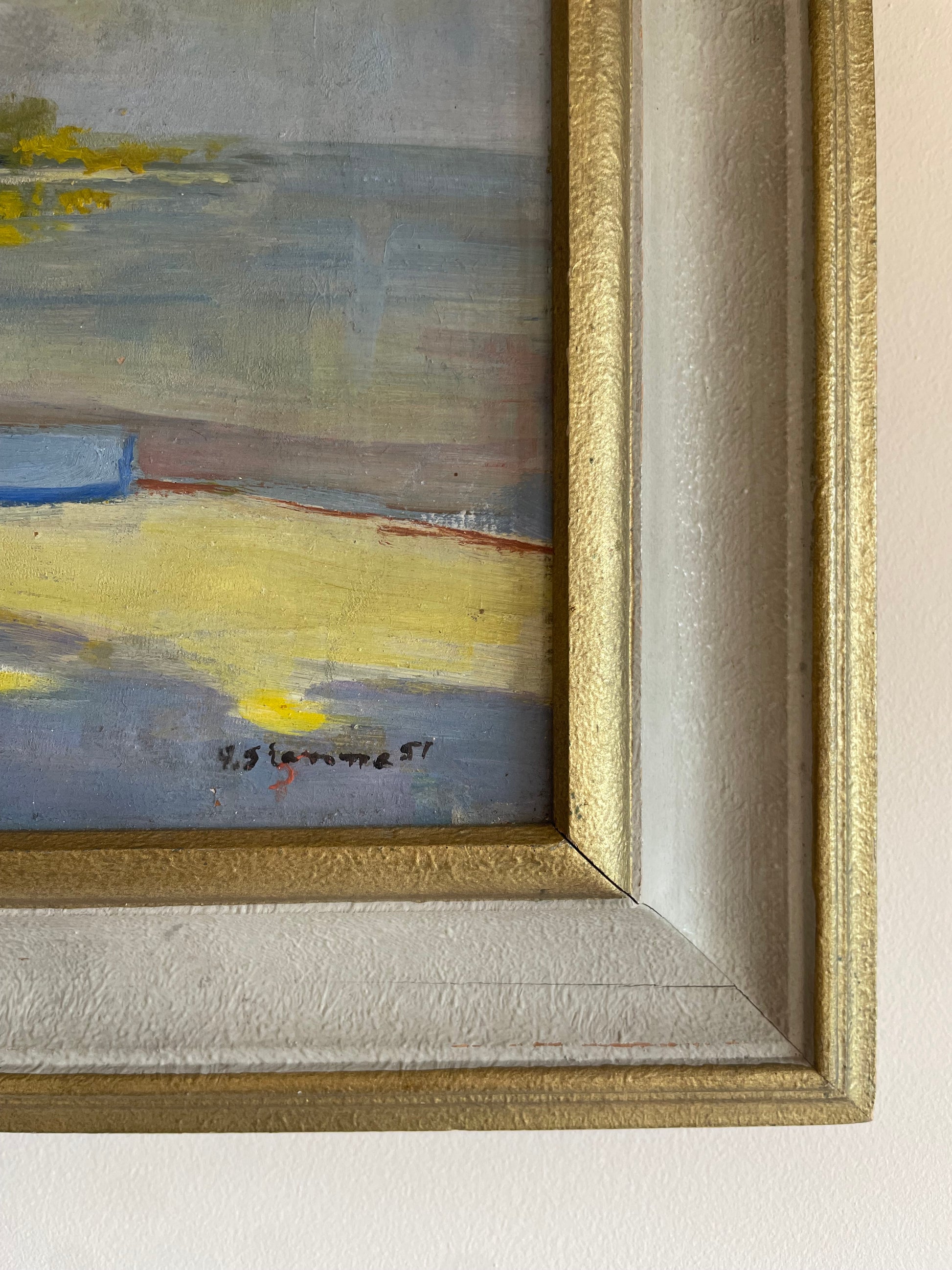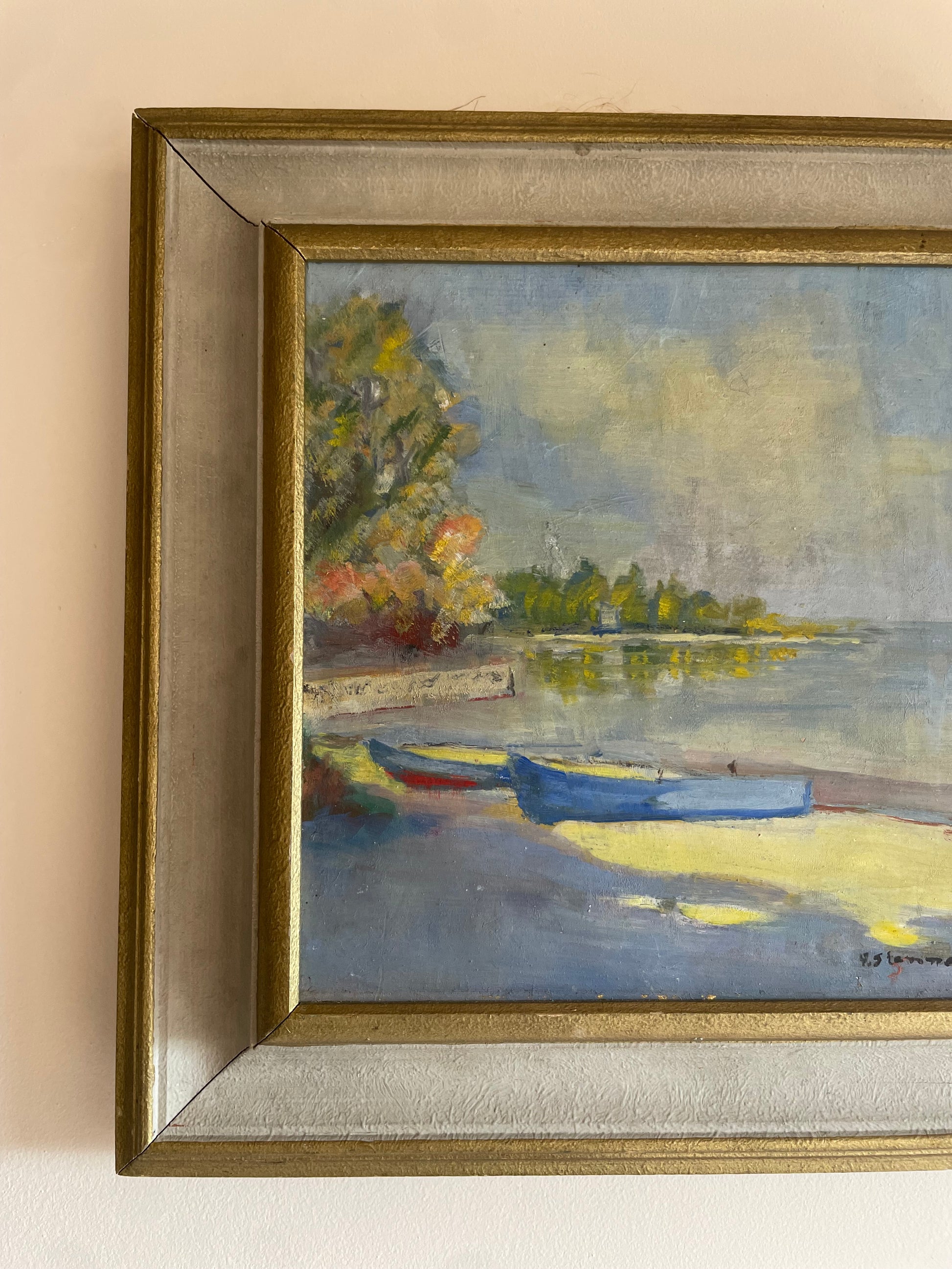 A soft, light-filled vintage oil painting depicting small boats resting on a peaceful shoreline. Gentle brushwork and pastel tones bring a summery warmth to the scene, with reflections dancing across the water.