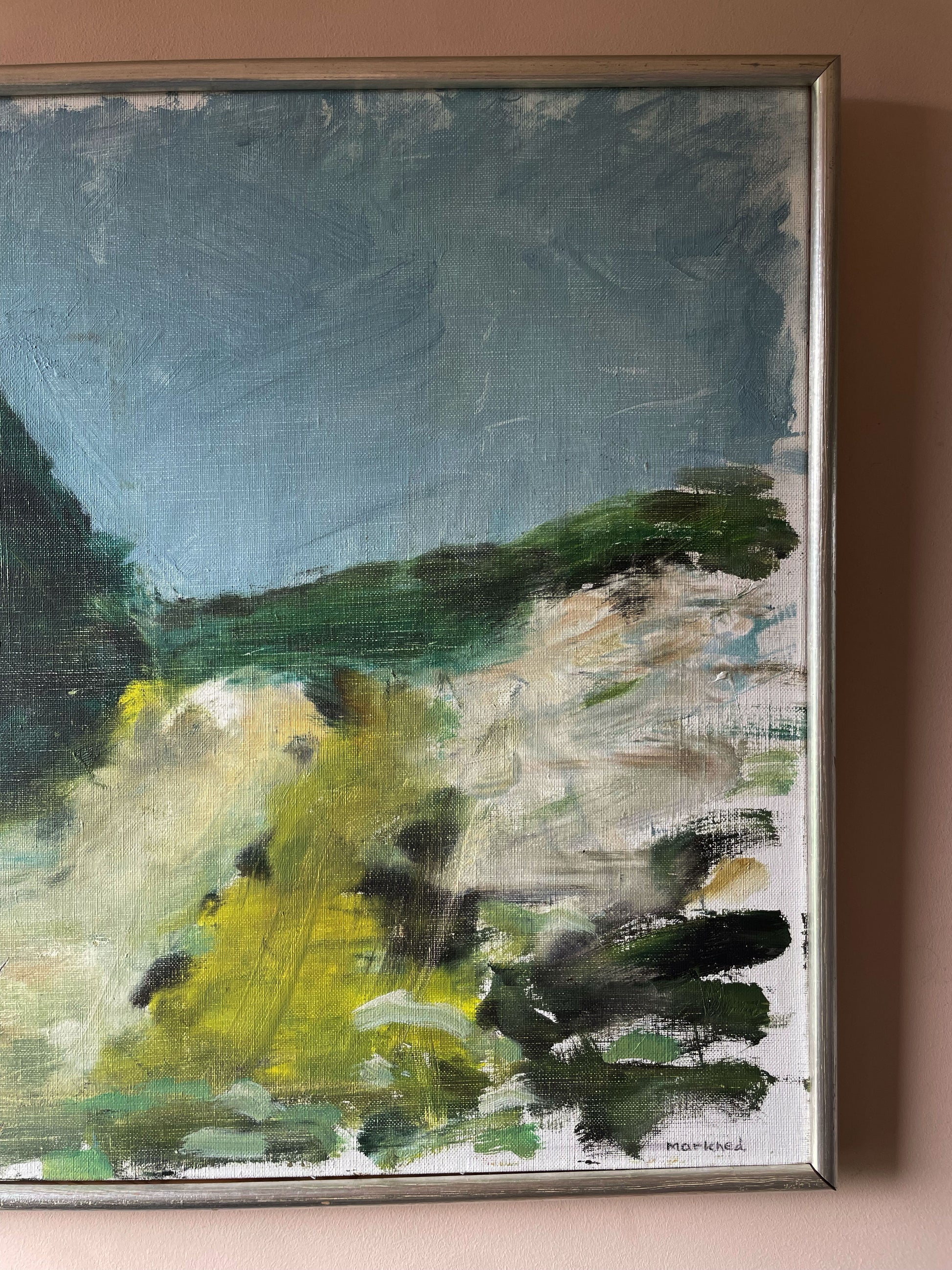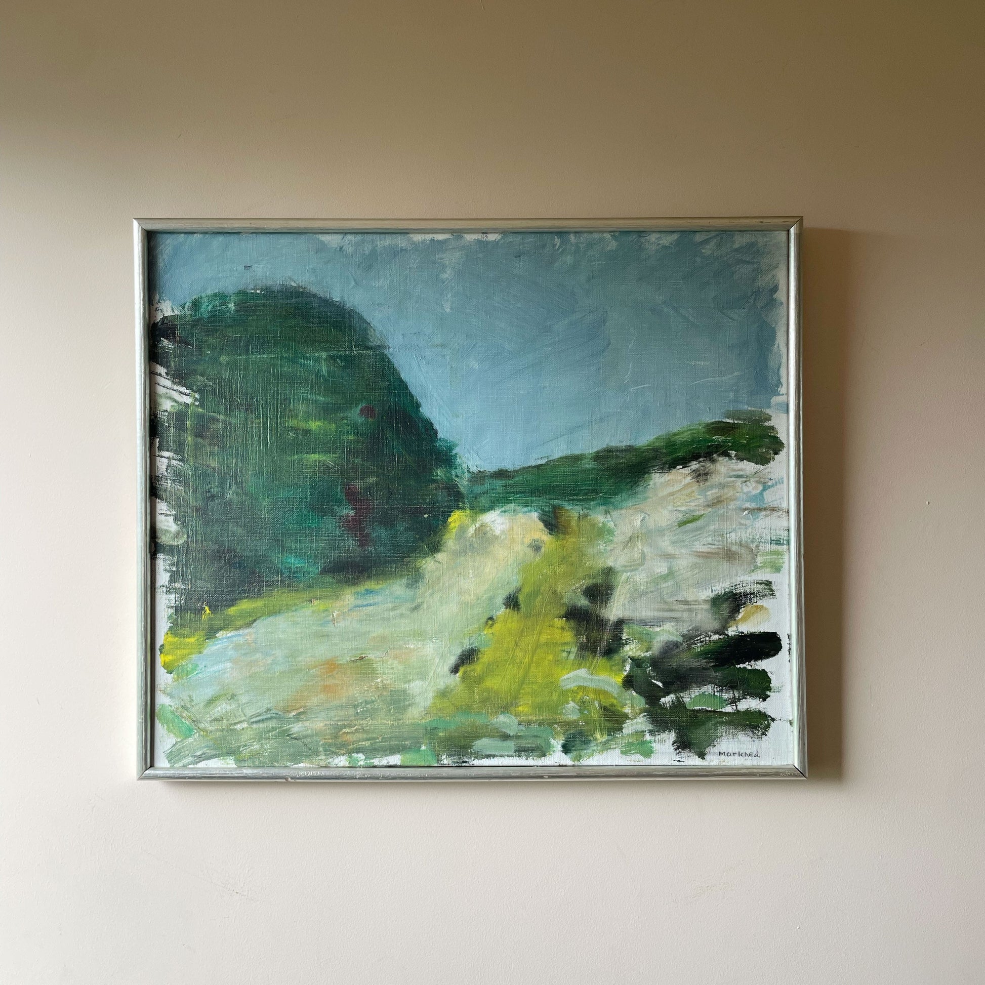 A mid-century inspired abstract landscape with confident, painterly brushwork and a beautifully pared-back composition. Deep forest greens and soft blue-grey skies are lifted with spring yellow, creating a sense of light and movement across the scene. Textured and expressive up close, calm and balanced from a distance.