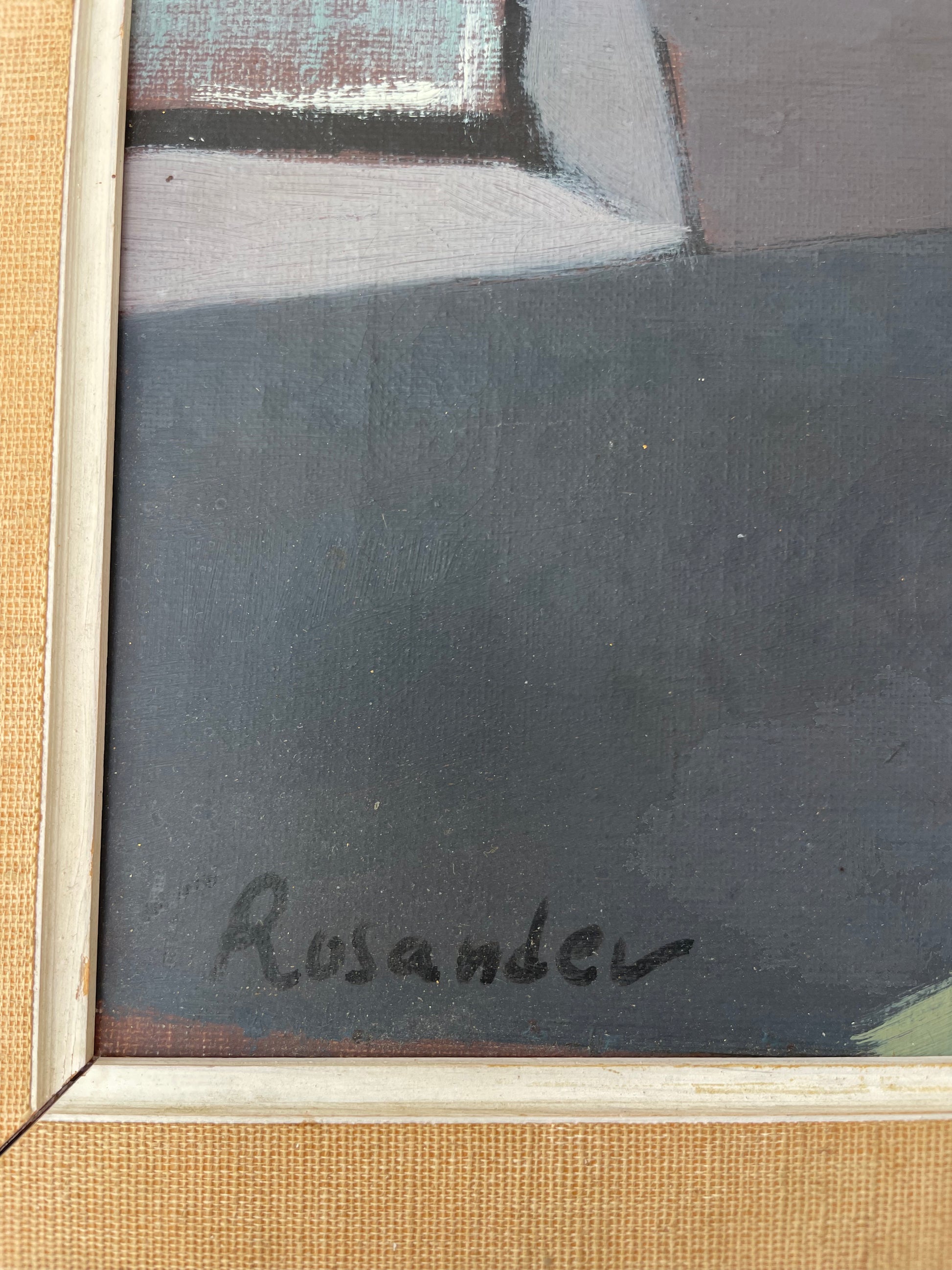 A mid-century modern still life in soft greys and ochres, with bottles, jug and citrus fruit emerging from deep shadow. Simple shapes and bold contrasts create a calm, graphic focal point for any room.