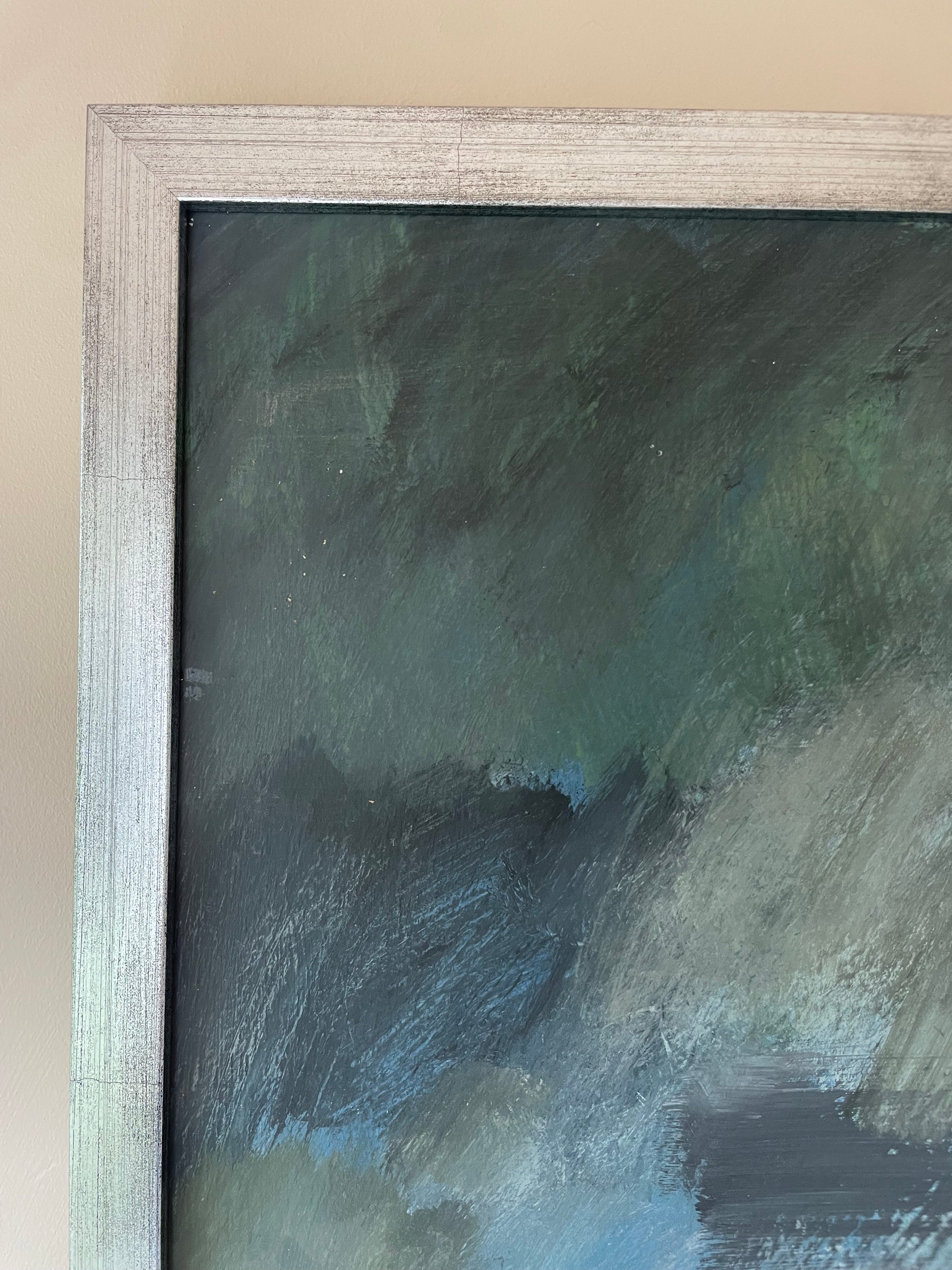 A dramatic and minimalist painting capturing the moment a stormy open landscape. Deep green fields are set against a powerful sky of layered grey, blue, and charcoal tones. Moody and expressive.