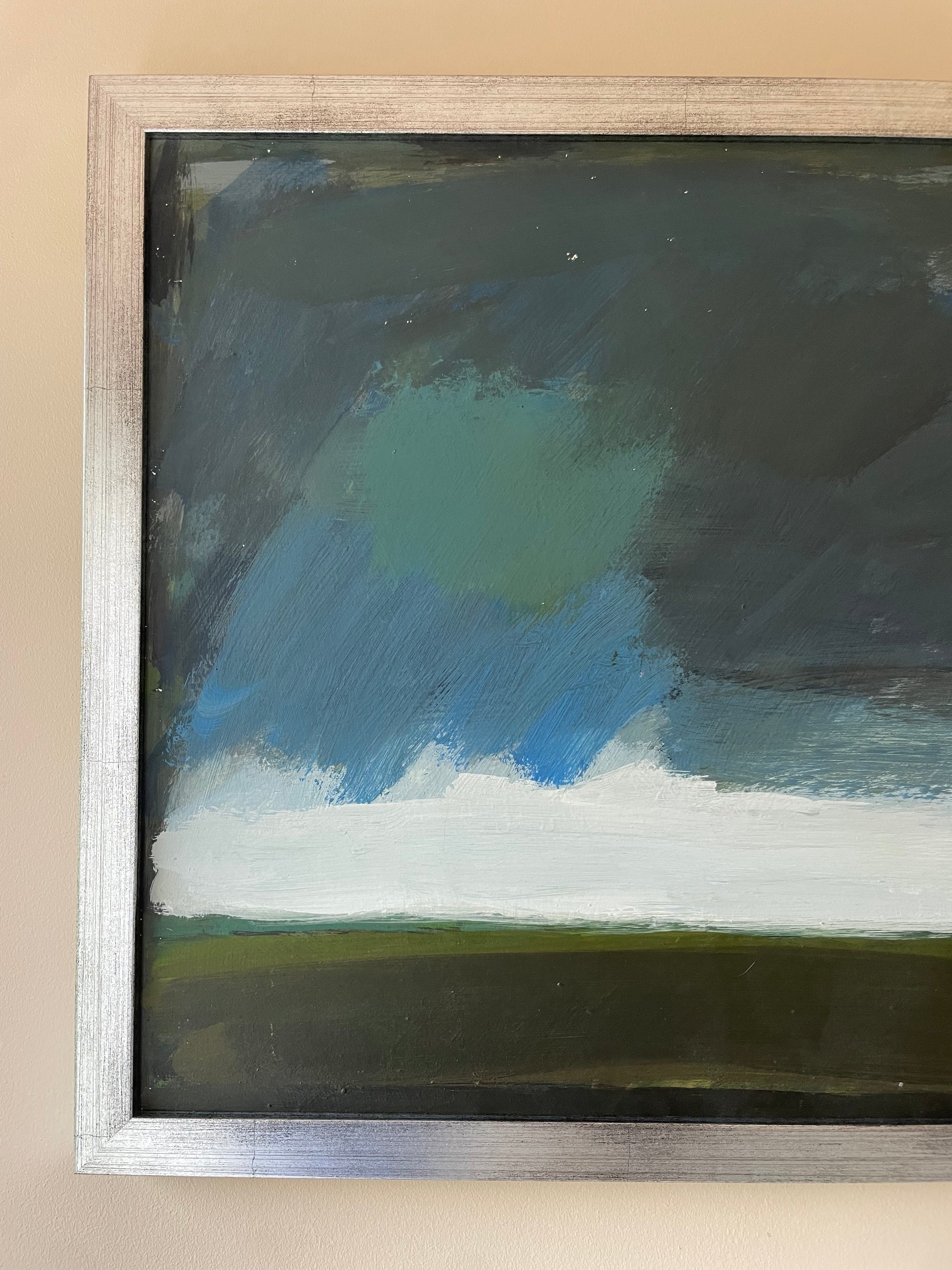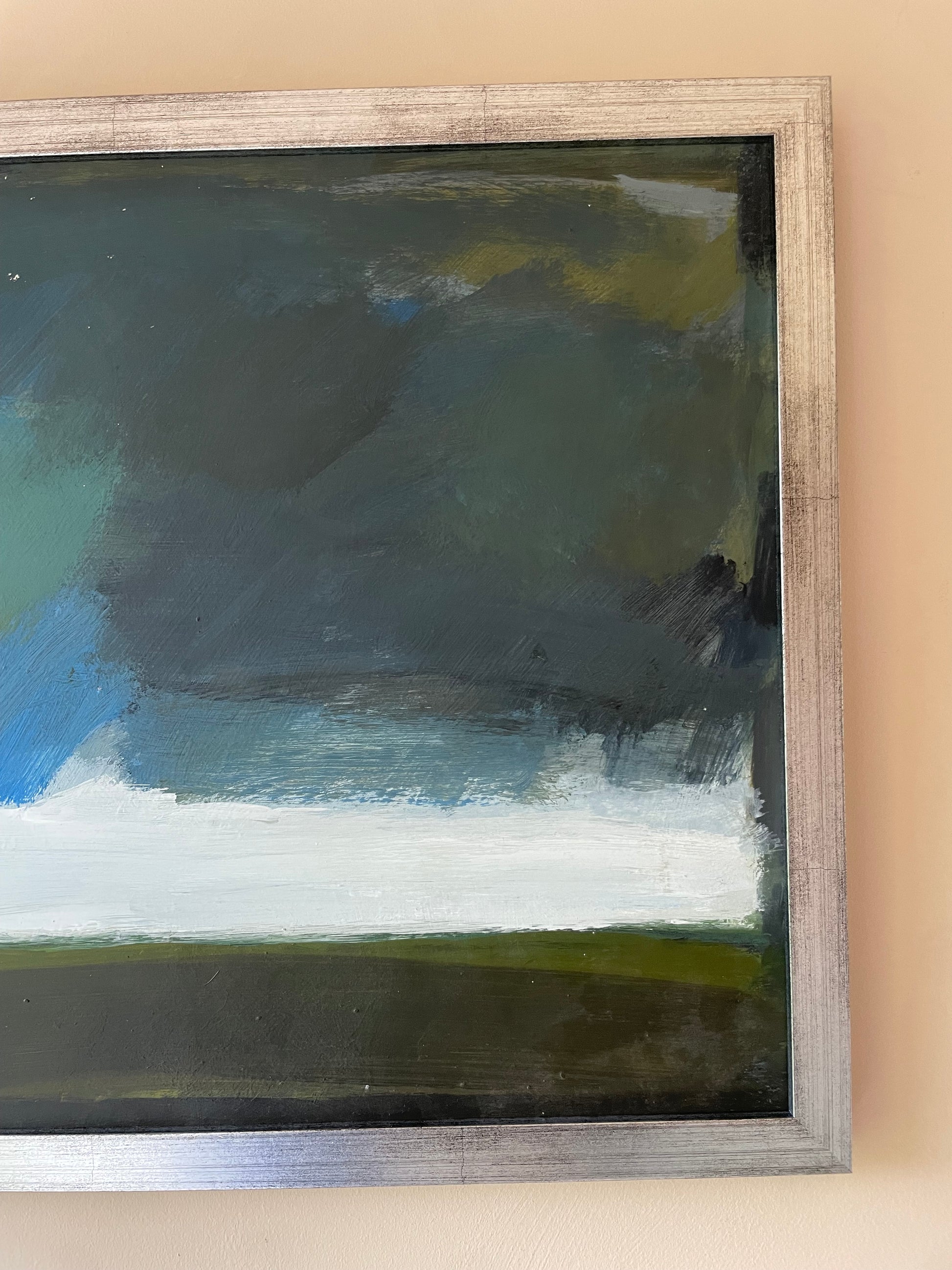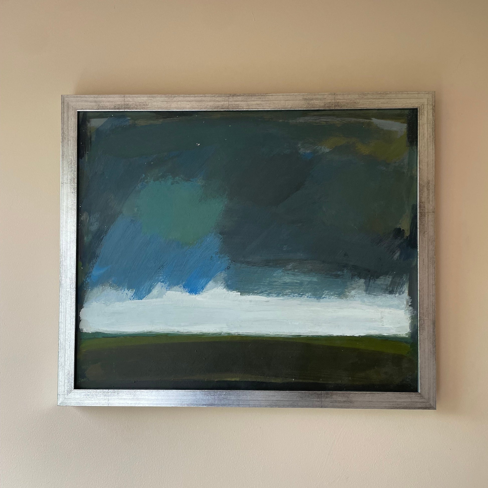 A minimalist and expressive painting capturing the moody stillness of a rain-washed landscape. Layers of deep blue, slate grey, and forest green evoke a brooding sky over distant fields. Striking in its simplicity.