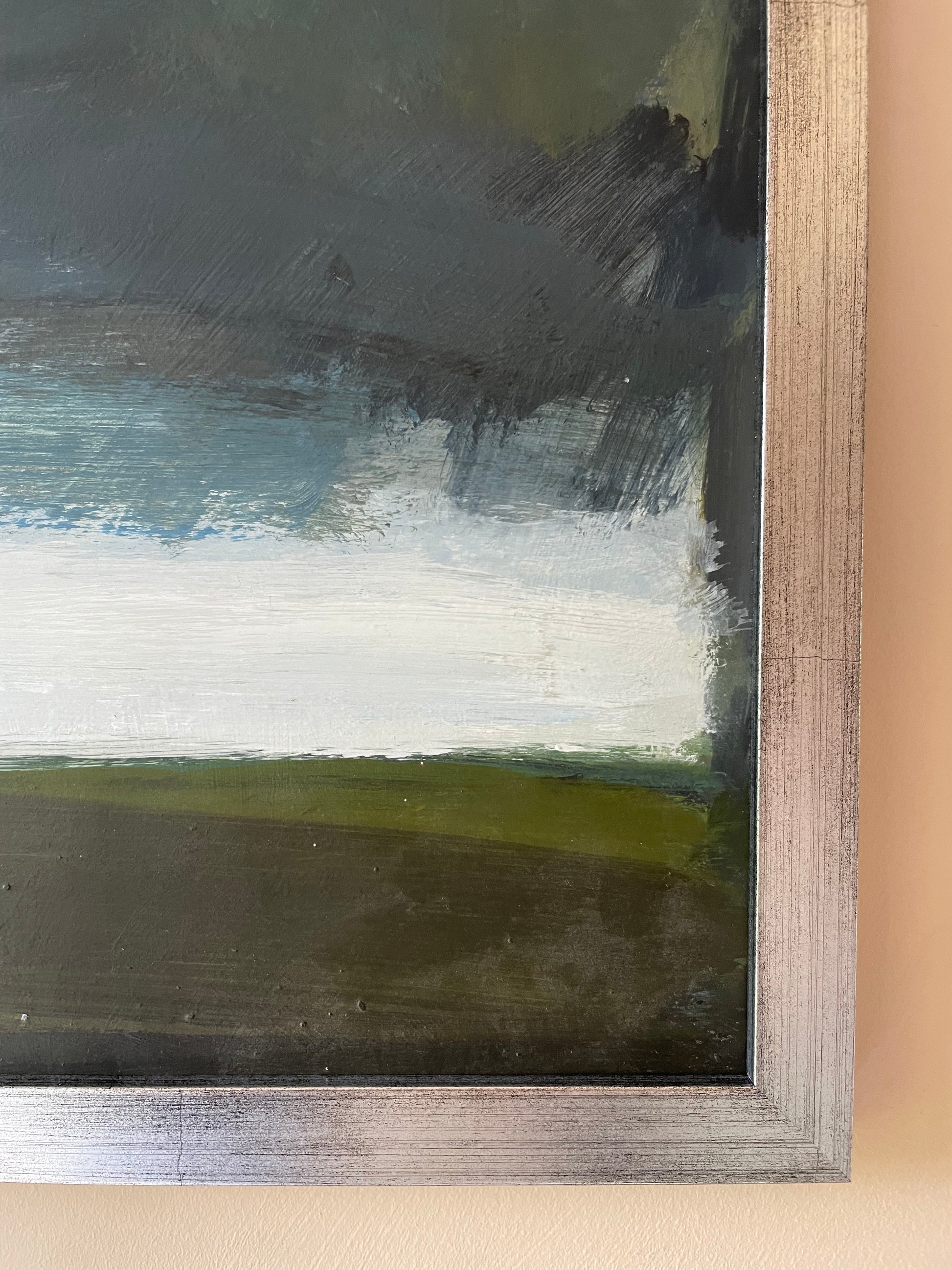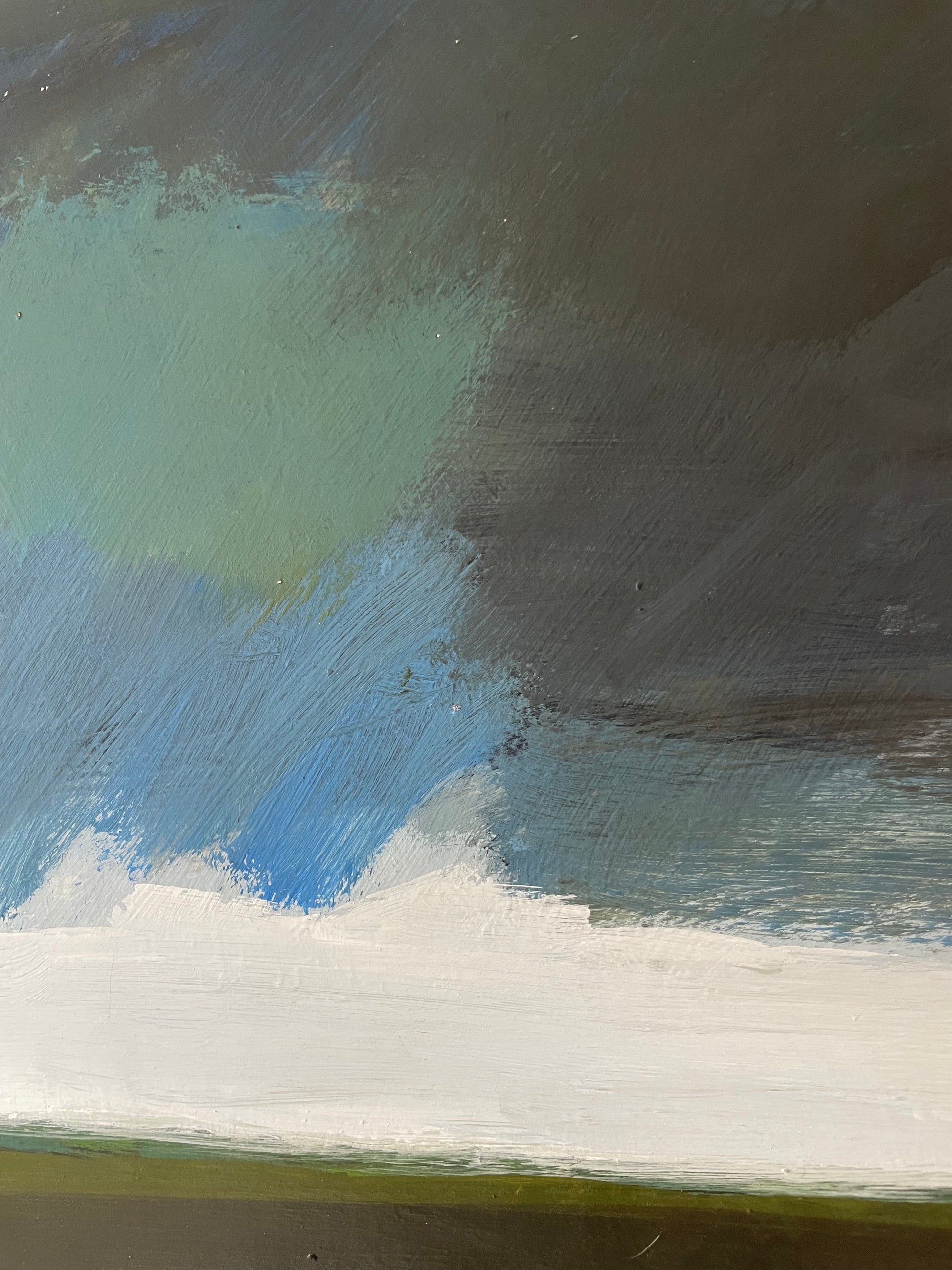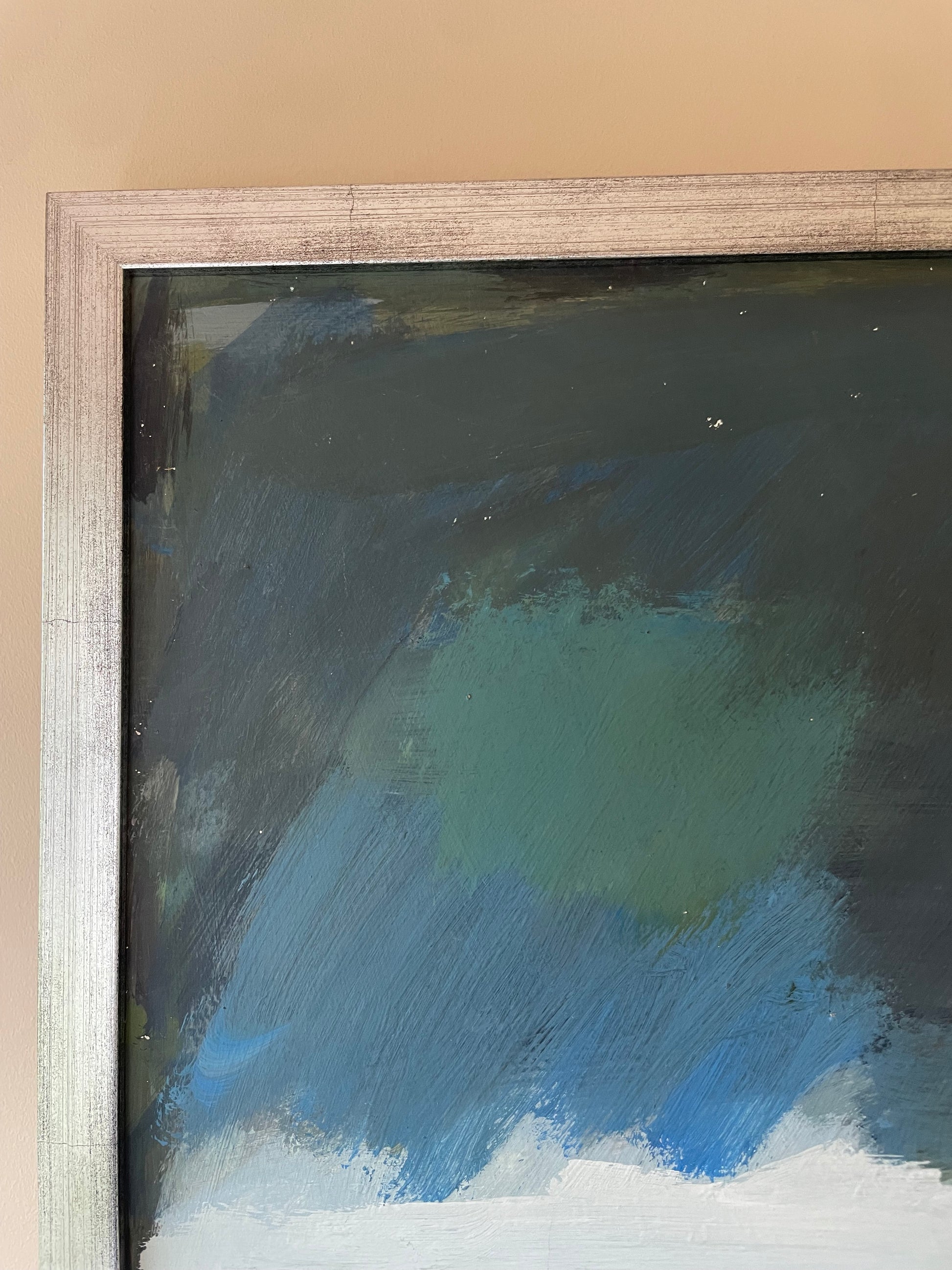 A minimalist and expressive painting capturing the moody stillness of a rain-washed landscape. Layers of deep blue, slate grey, and forest green evoke a brooding sky over distant fields. Striking in its simplicity.