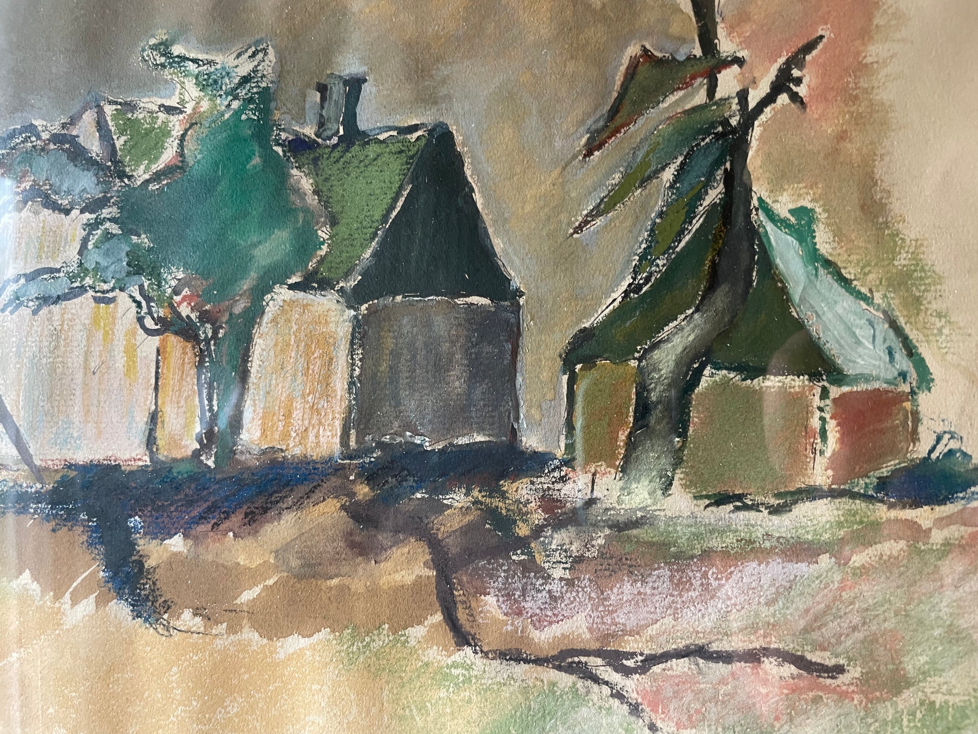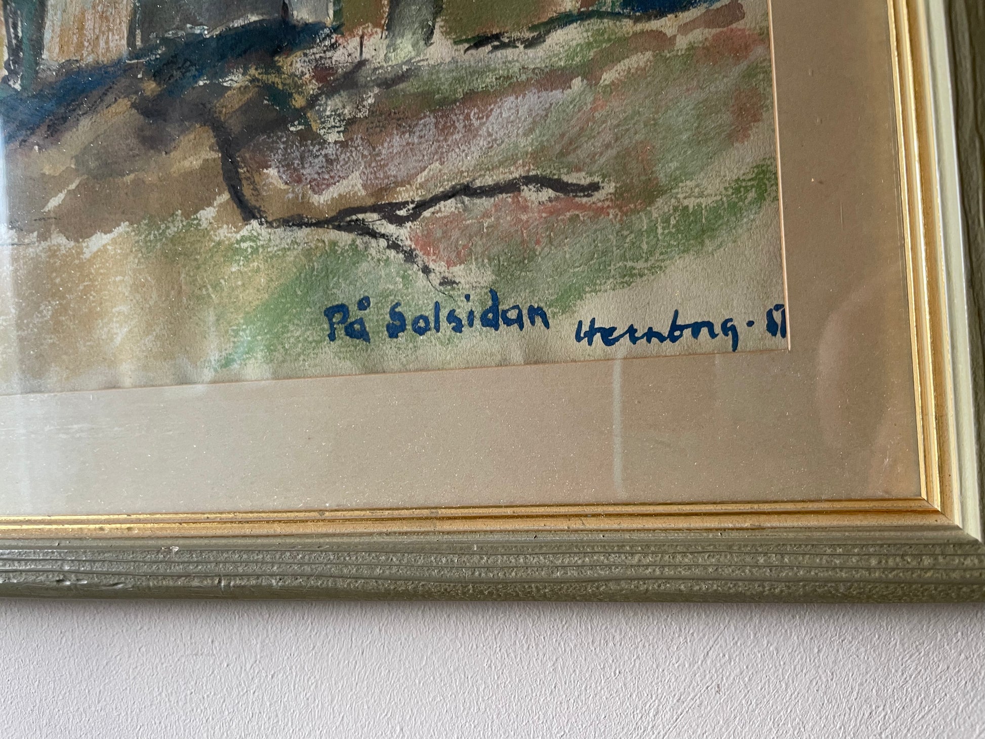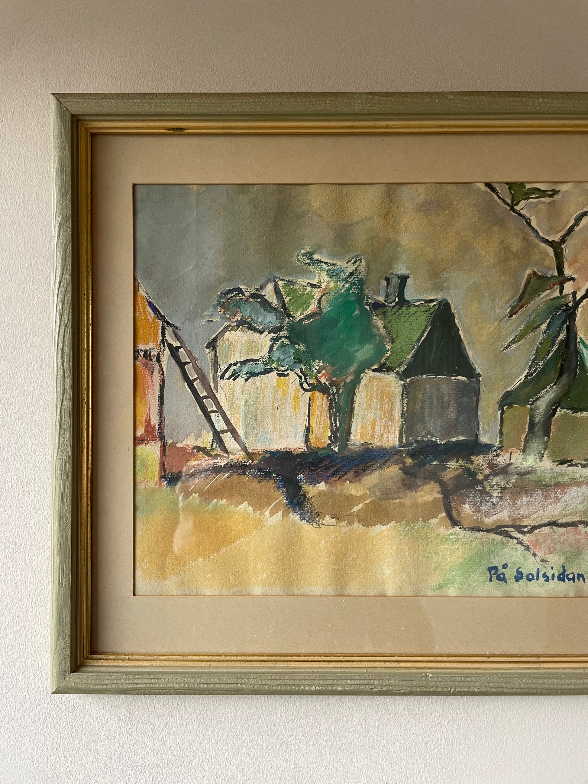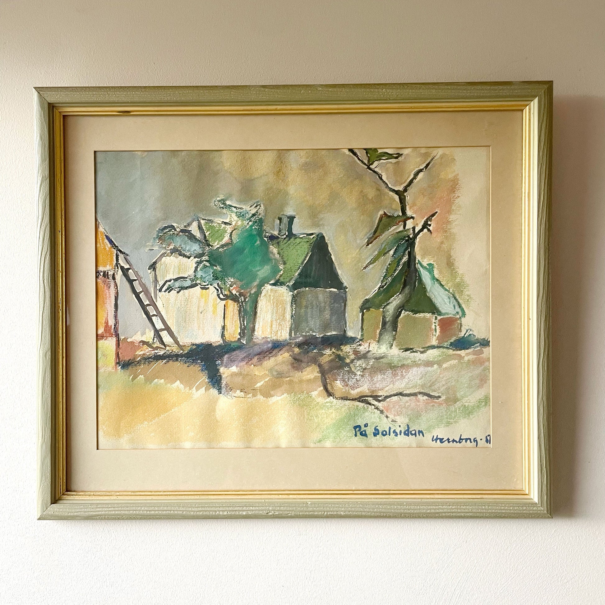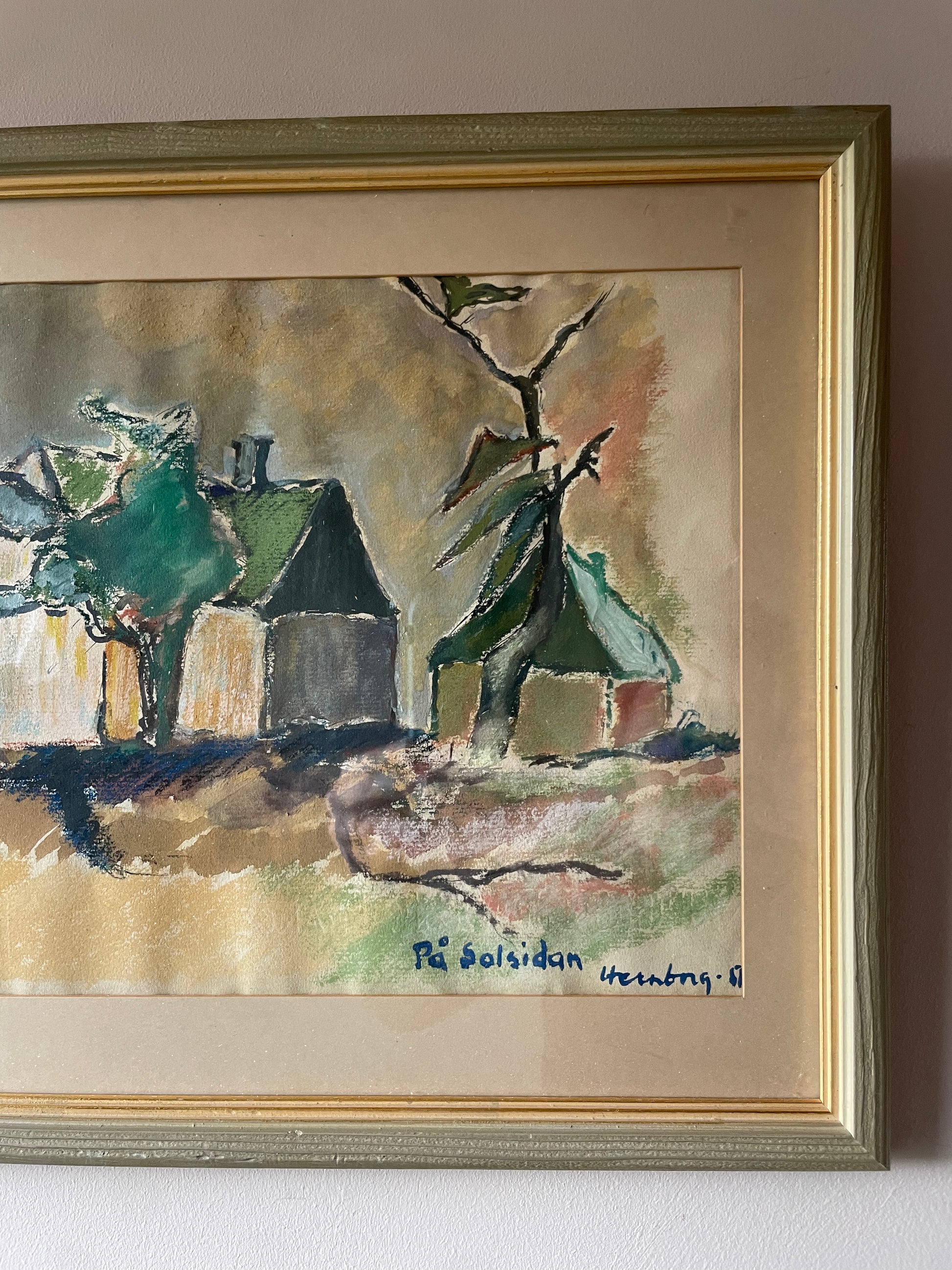 An atmospheric mid century Scandinavian mixed media piece showing a small village with green roofed houses and windswept trees, titled “På Solsidan” (On the Sunny Side). Loose brushwork and a soft palette of greens, ochres, and greys give it a gentle modernist feel.