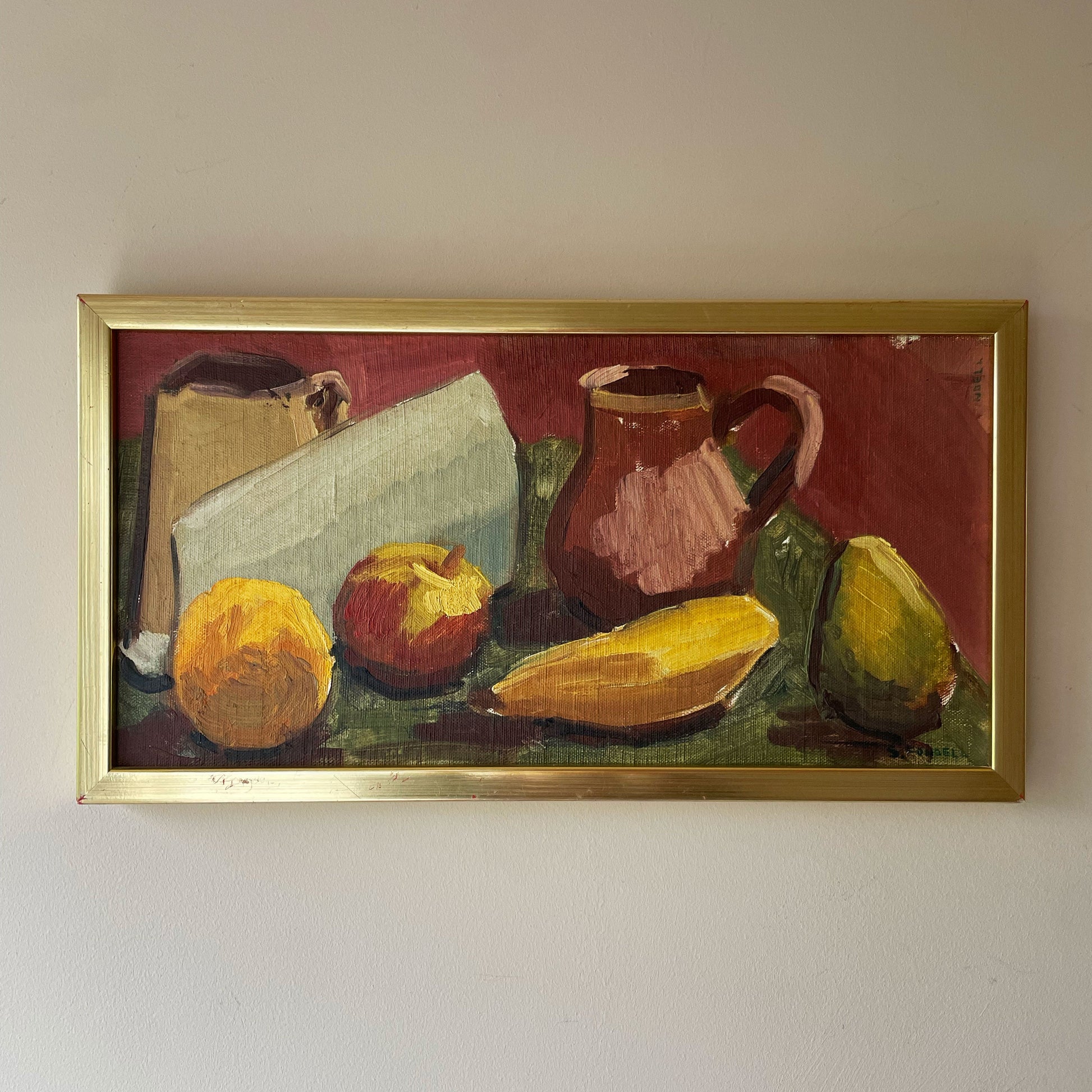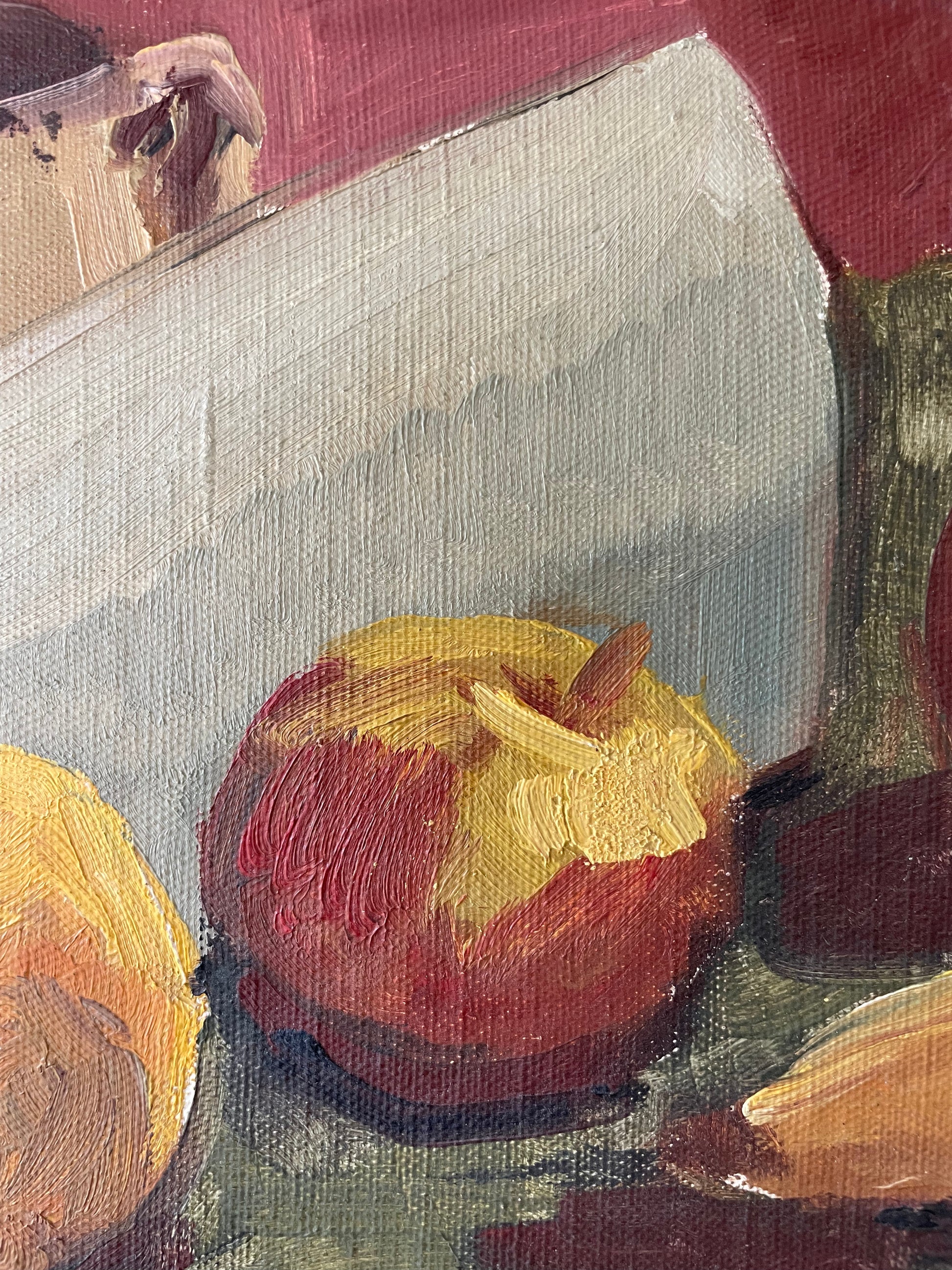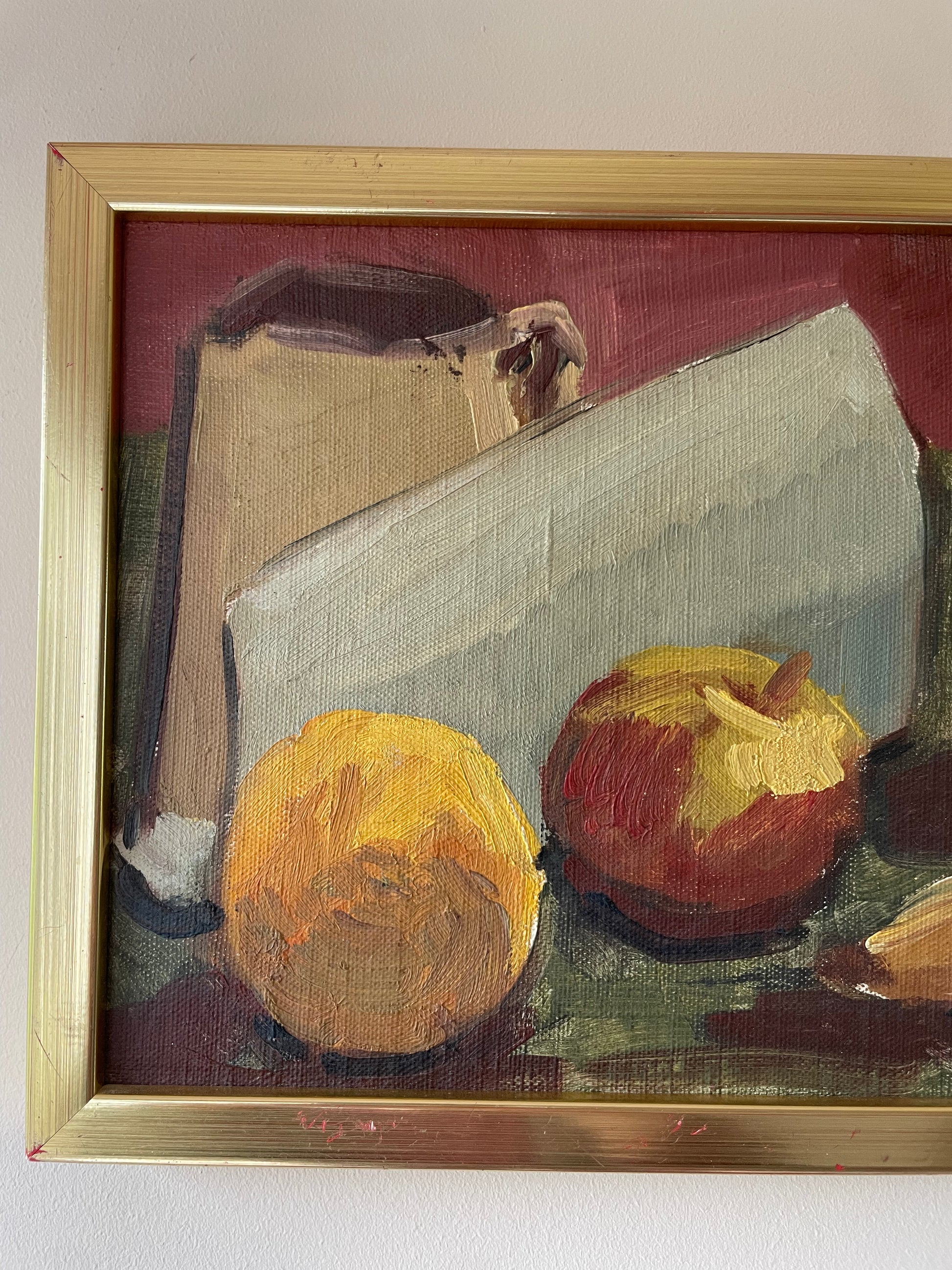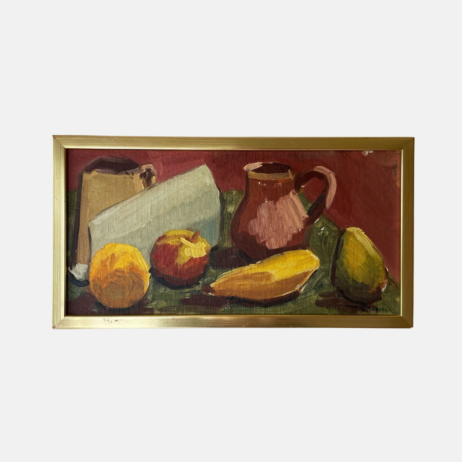 A richly coloured still life featuring a ceramic jug and fruit arranged on a deep red background. Confident brushstrokes and a warm earthy palette.