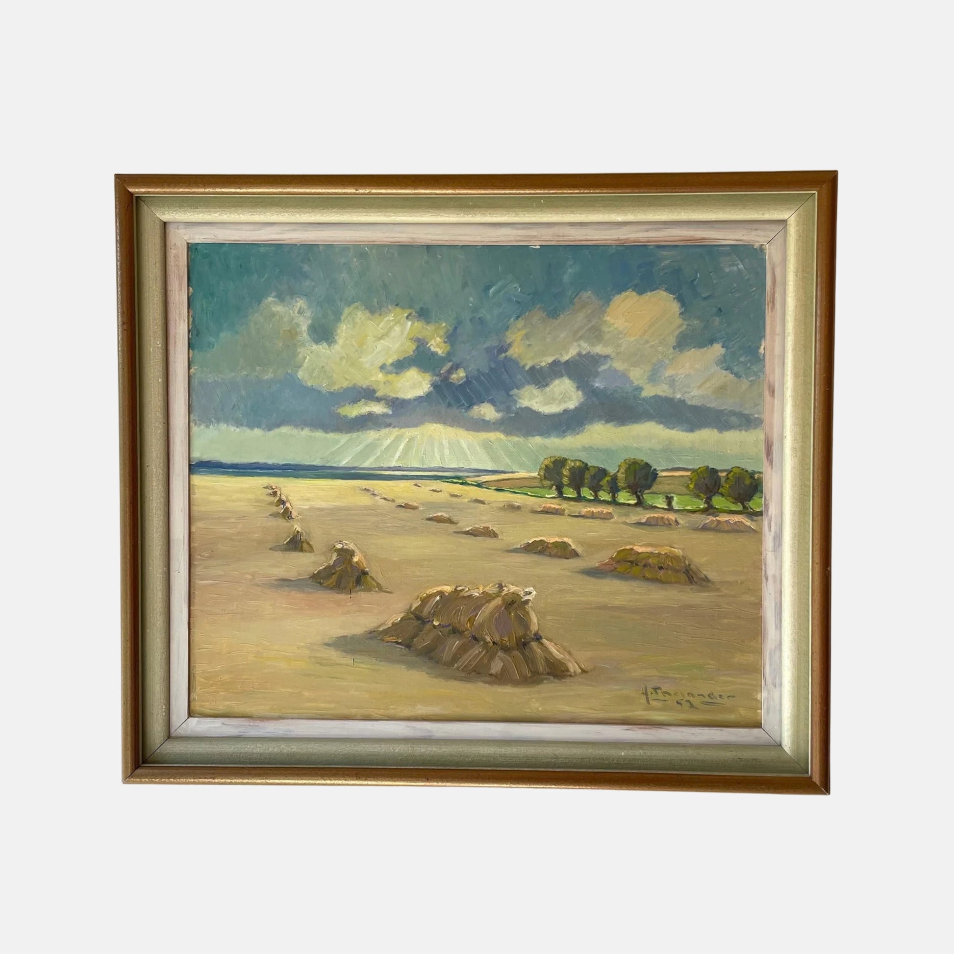 This peaceful landscape painting shows neatly gathered haystacks stretching across a sunlit field, with dramatic clouds parting to reveal soft rays of light on the horizon. A row of distant trees adds depth to the open countryside scene.