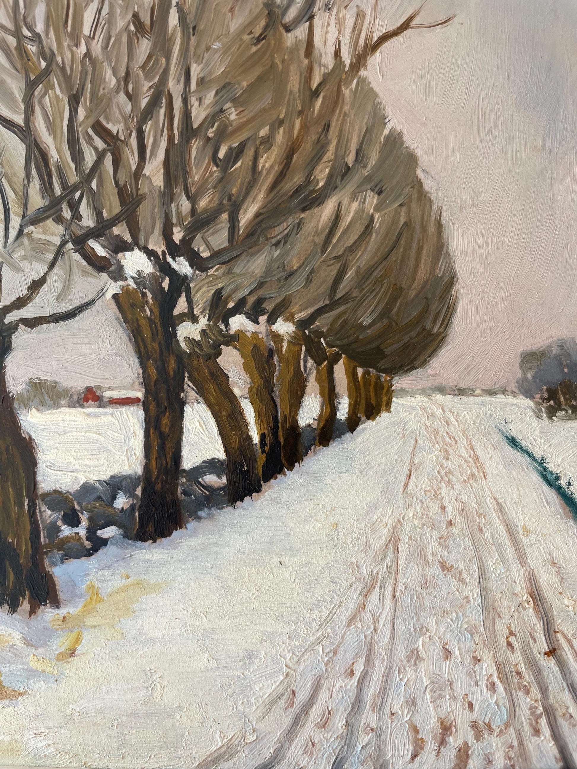 A wintry rural landscape showing a snow-covered, tree lined track leading to distant Swedish barns under a moody sky.