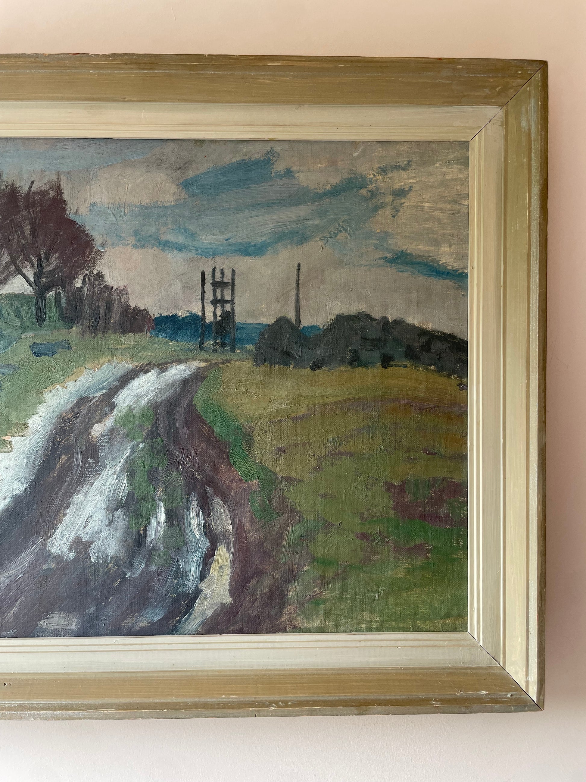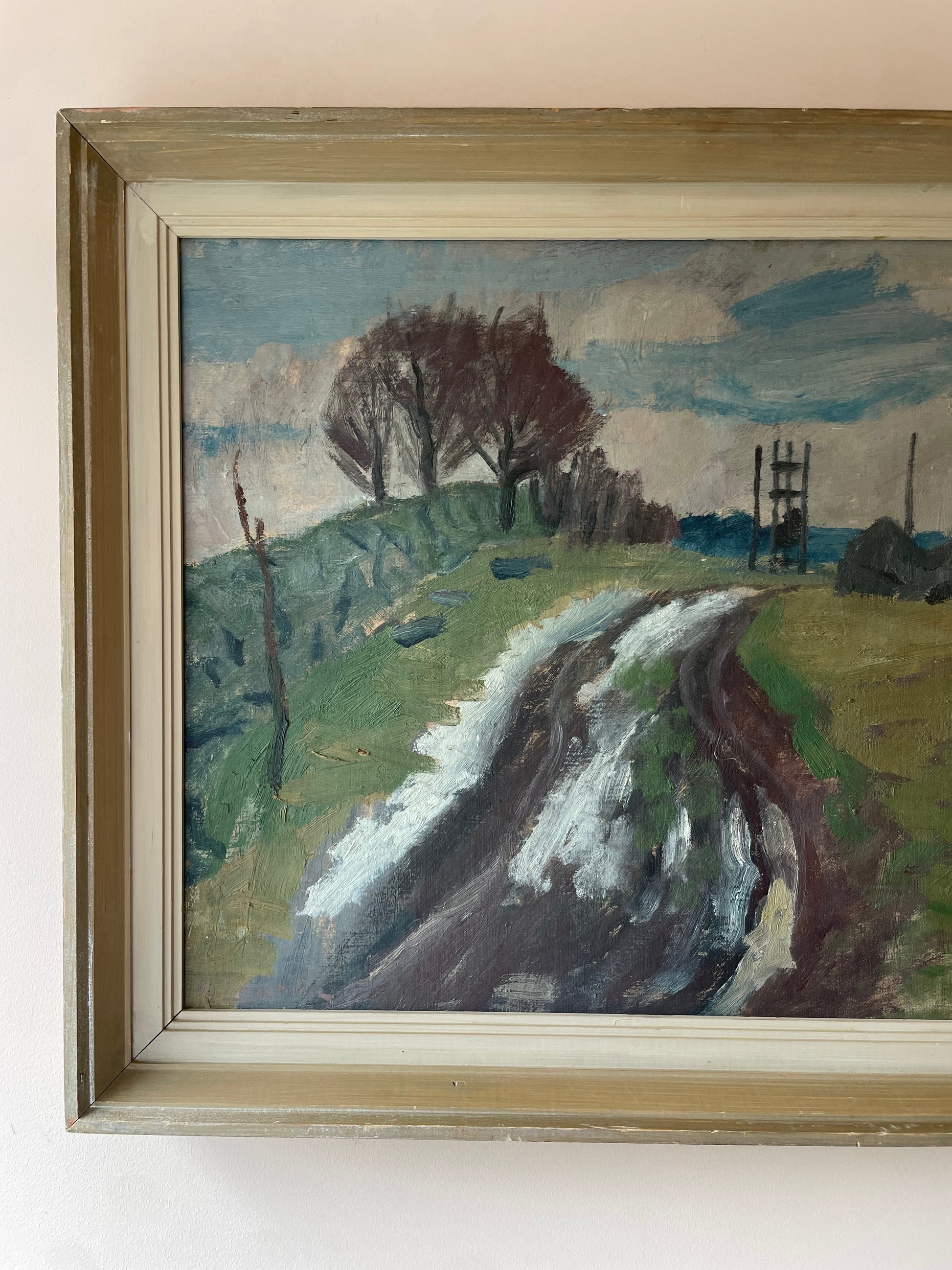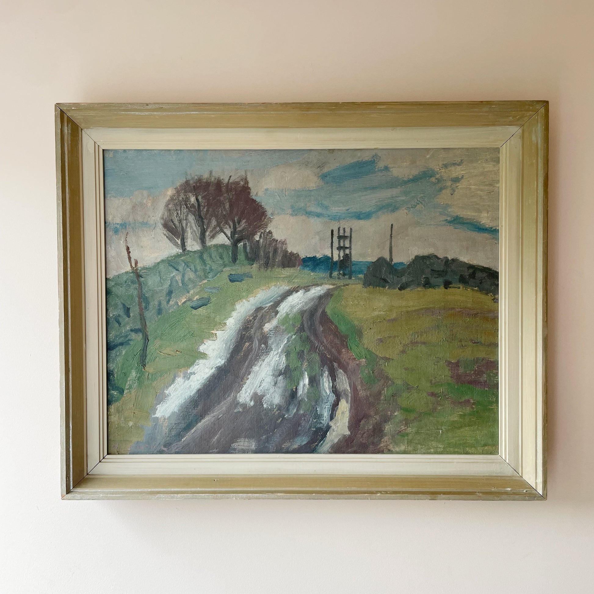 A serene mid-century landscape capturing a winding country lane after rainfall. Painted in soft, expressive brushstrokes with cool greens, muted browns, and gentle blues, it evokes the quiet beauty of rural life and the calm that follows a storm.