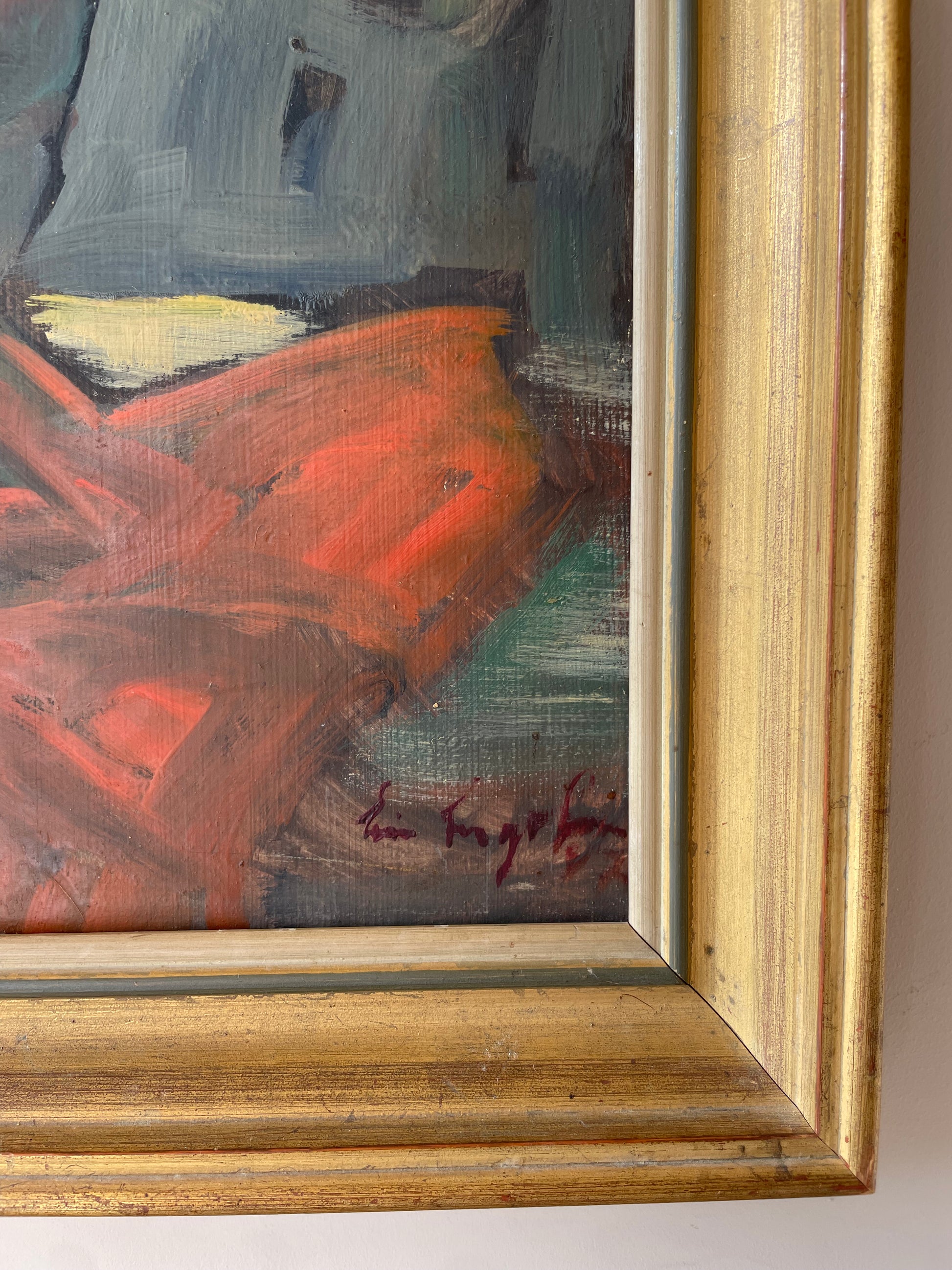 Expressive mid-century still life with bold zinnia blooms, a bowl of fruit and a vivid red cloth, all framed in warm gilt for a richly atmospheric focal point.